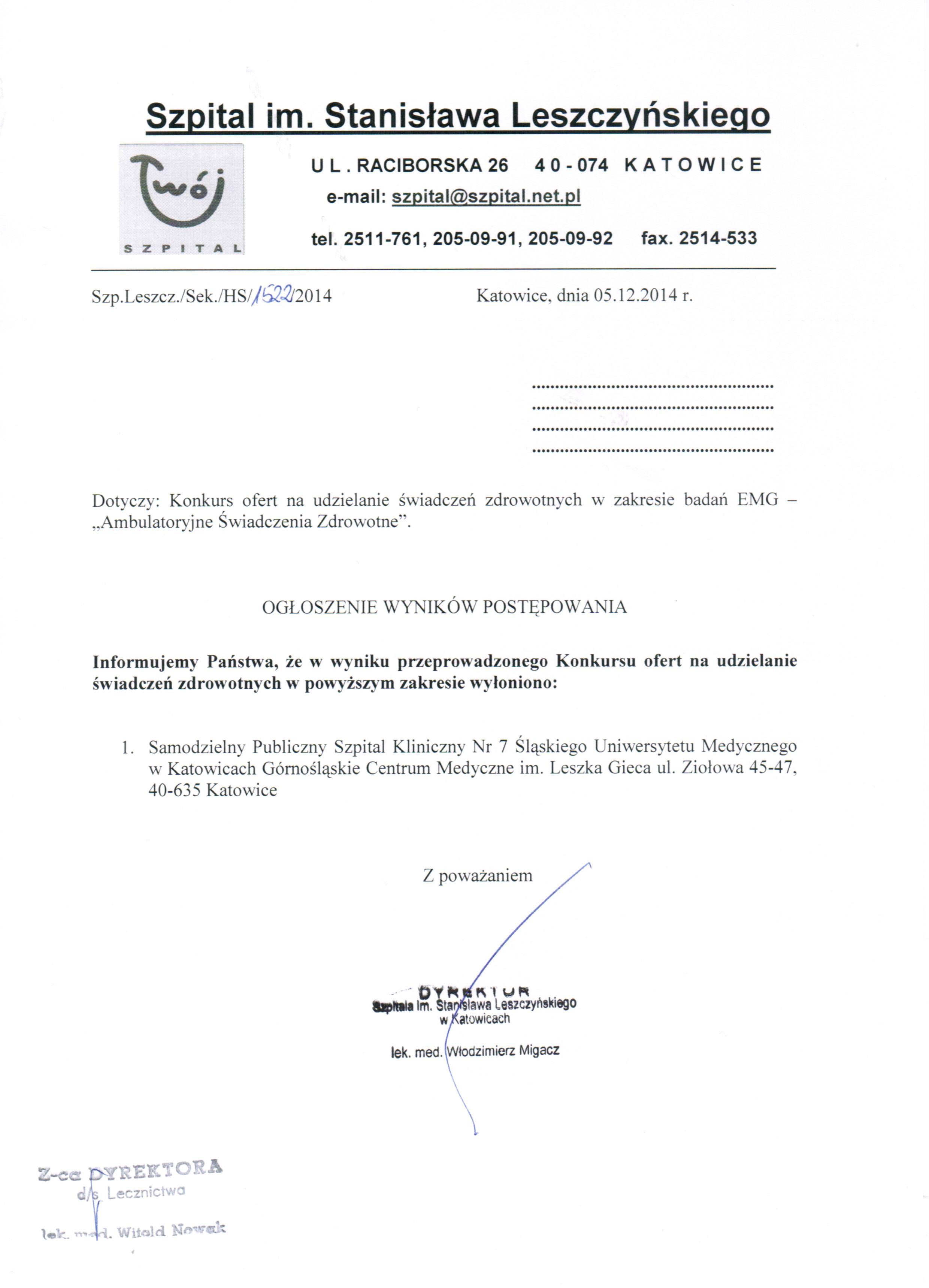 Szpital im. Stanisława Leszczyńskiego w Katowicach ul. Raciborska 26 zwany dalej Udzielającym Zamówienia, ogłasza zamówienie na udzielanie świadczeń zdrowotnych - badania EMG - "Ambulatoryjne Świadczenia Zdrowotne".