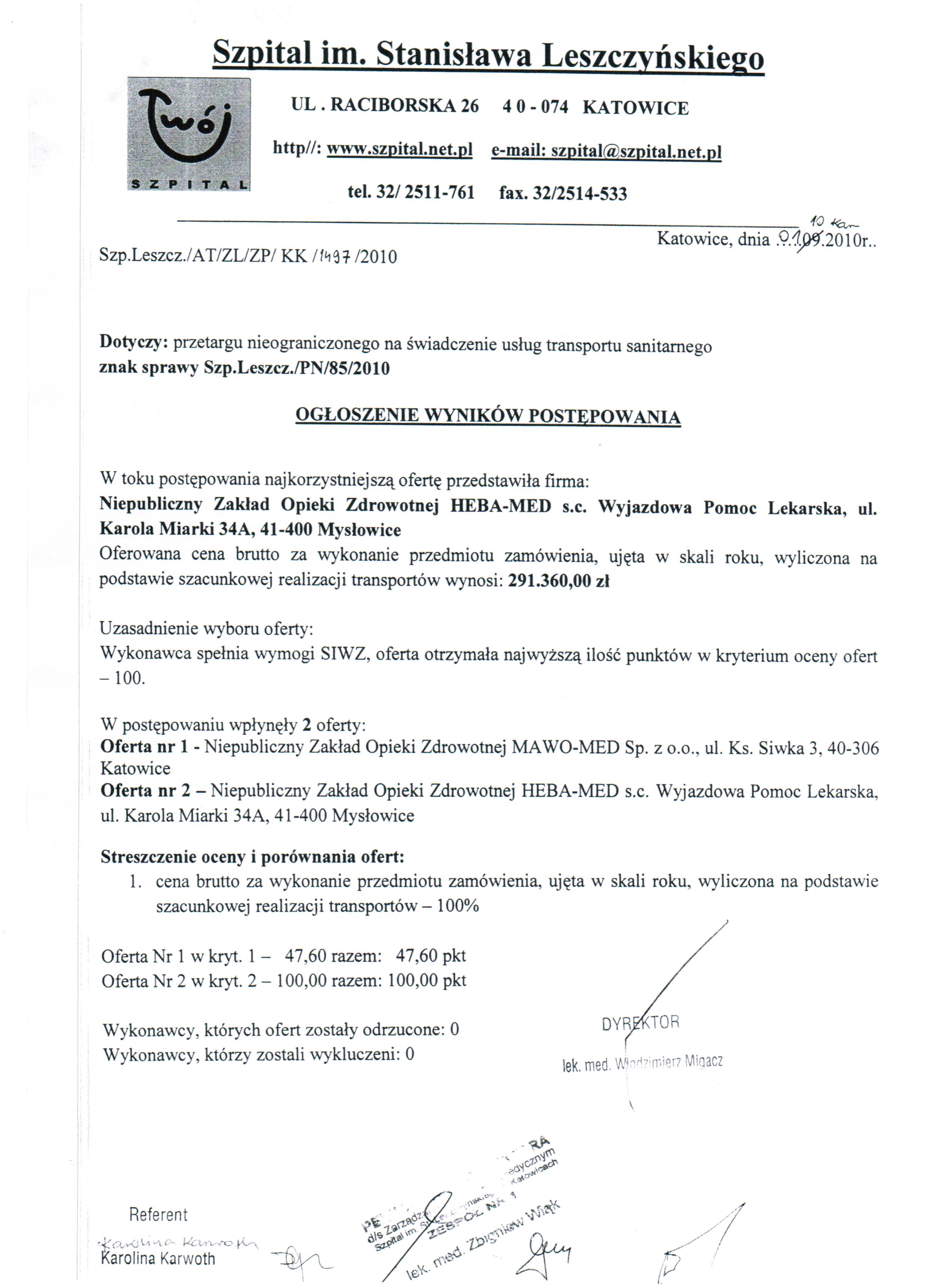 Ogłoszenie wyników postępowania (01.10.2010)