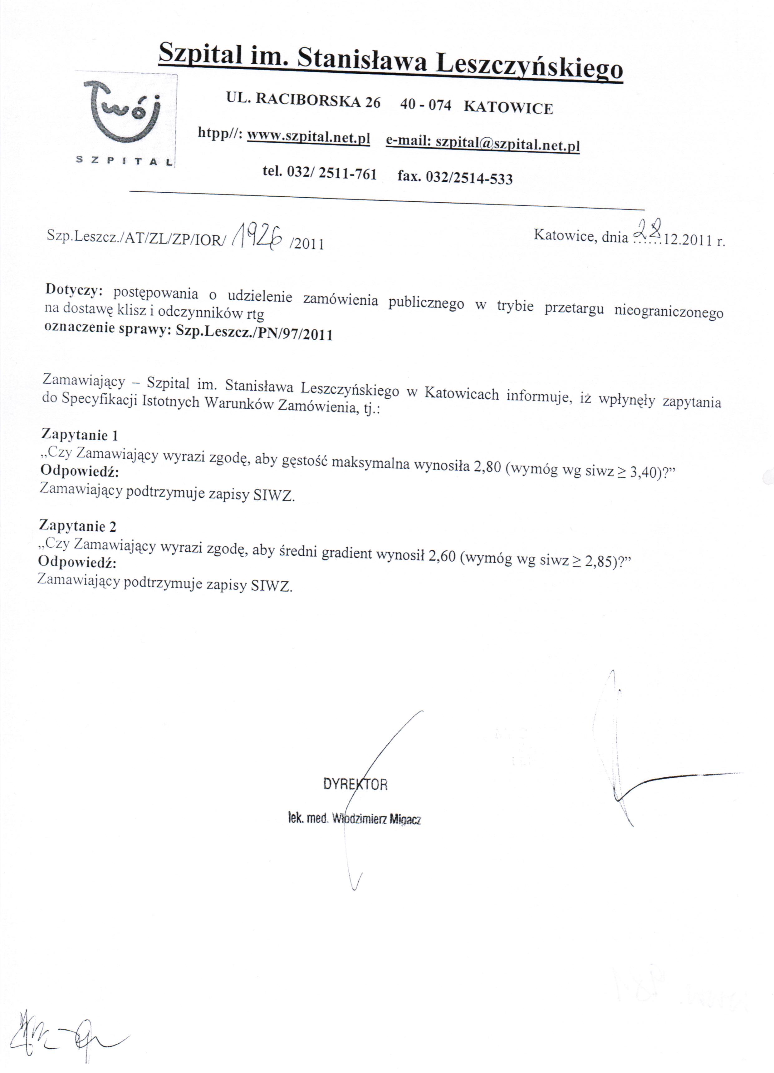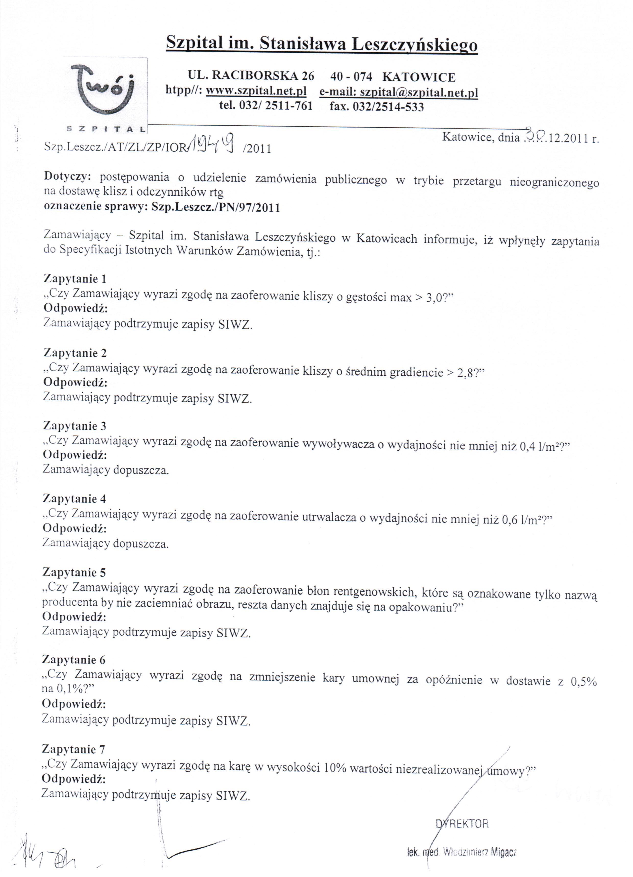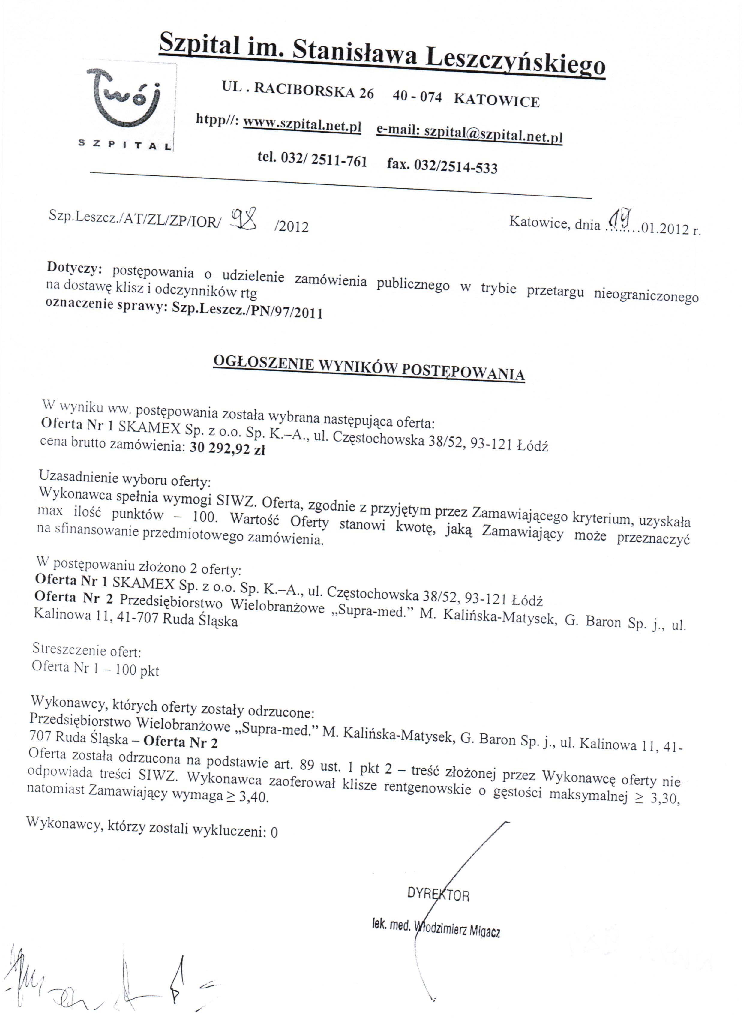 Otwarcie ofert nastąpi w dniu 05.01.2012r. o godz. 11:00 w 40 – 074 Katowice, ulica Raciborska 28, budynek Przychodni, II piętro, Sekcja Zamówień Publicznych.