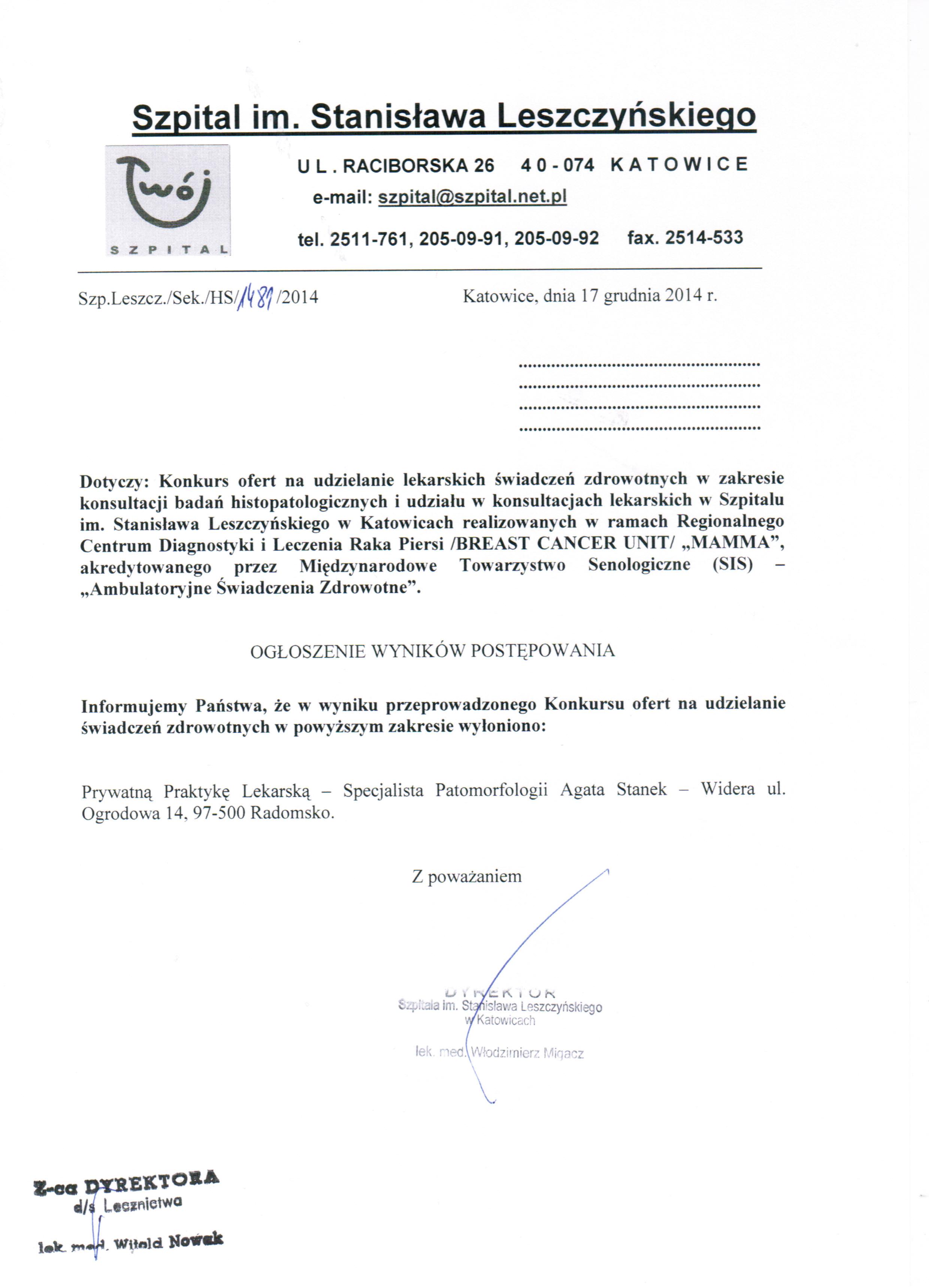 "Konkurs ofert - oferta na lekarskie świadczenia zdrowotne w zakresie konsultacji badań histopatologicznych i udziału w konsultacjach lekarskich w Szpitalu im. Stanisława Leszczyńskiego w Katowicach realizowanych w ramach Regionalnego Centrum Diagnostyki i Leczenia Raka Piersi /BREAST CANCER UNIT/ "MAMMA", akredytowanego przez Międzynarodowe Towarzystwo Senologiczne (SIS) – "Ambulatoryjne Świadczenia Zdrowotne".
