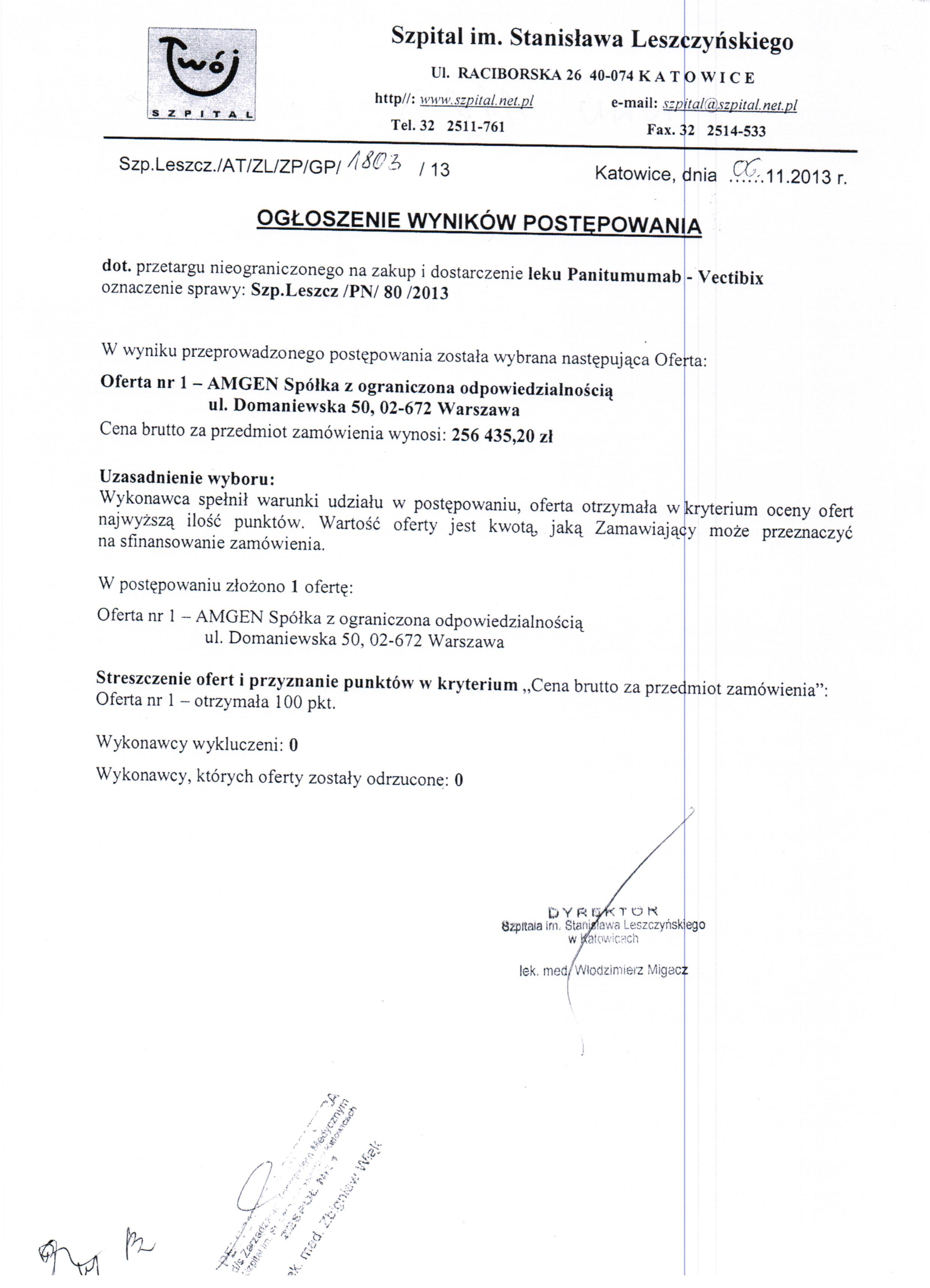 ogłasza przetarg nieograniczony o wartości szacunkowej zamówienia powyżej 14 000 euro na zakup i dostarczanie leku Panitumumab