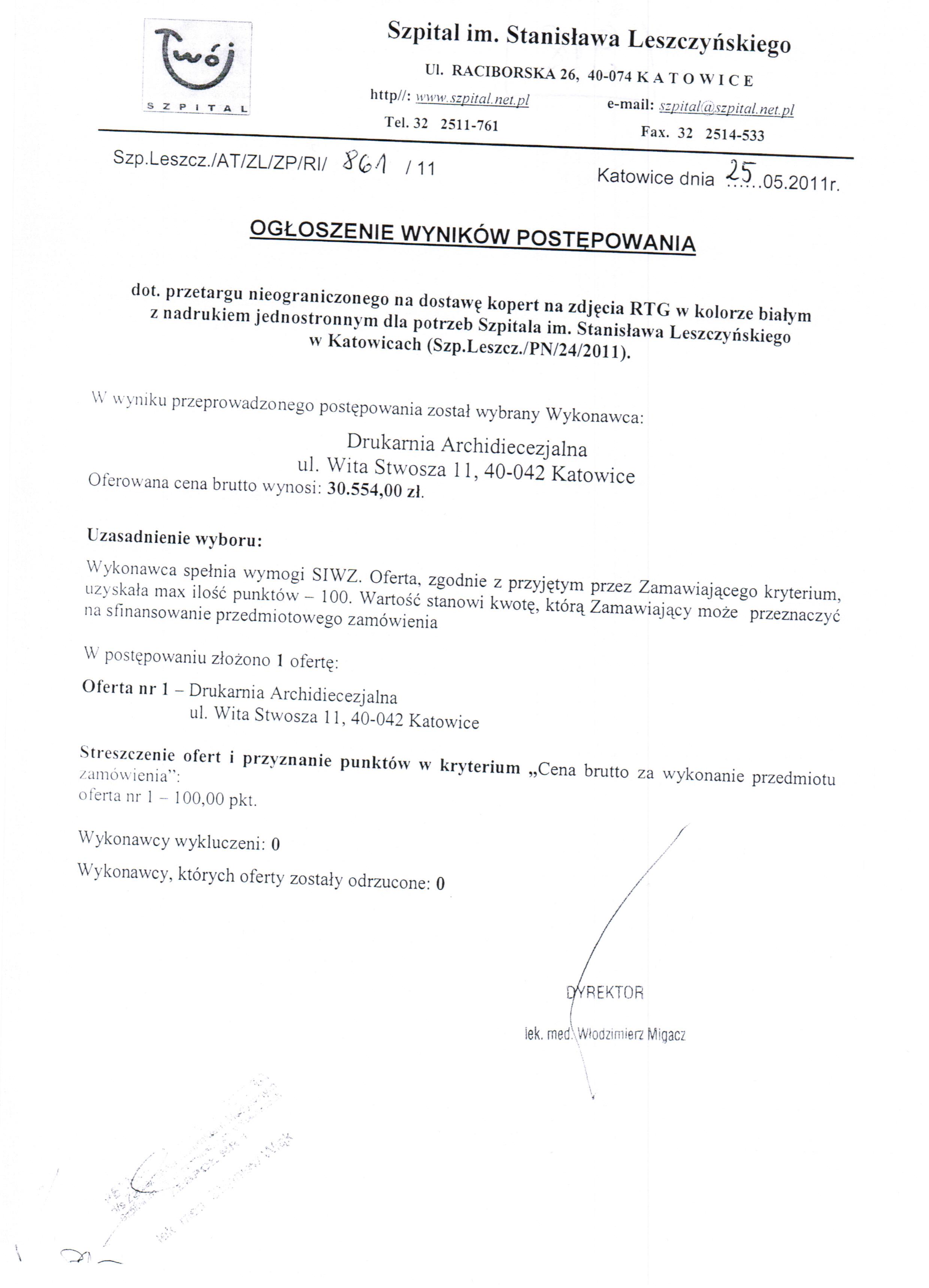 w dniu 28.04.2011r. o godz. 11:00 w Szpitalu im. Stanisława Leszczyńskiego w Katowicach ul. Raciborska 28, budynek Przychodni, II piętro, Sekcja Zamówień Publicznych.