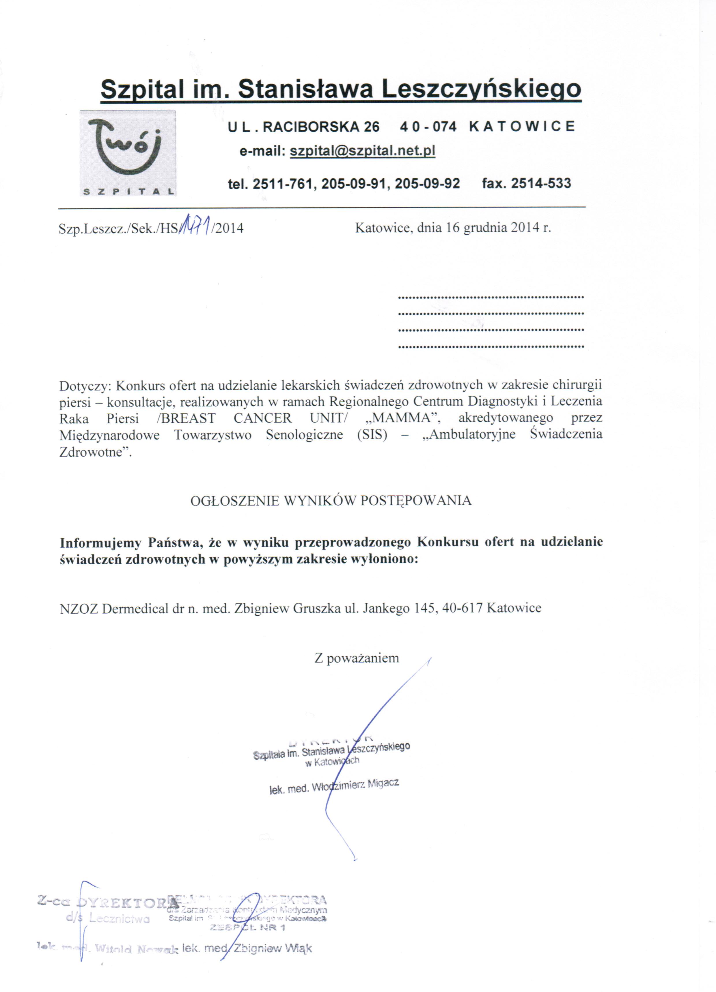 Szpital im. Stanisława Leszczyńskiego w Katowicach ul. Raciborska 26 zwany dalej Udzielającym Zamówienia ogłasza zamówienie na udzielanie lekarskich świadczeń zdrowotnych w zakresie chirurgii piersi – konsultacje, realizowanych w ramach Regionalnego Centrum Diagnostyki i Leczenia Raka Piersi /BREAST CANCER UNIT/ „MAMMA”, akredytowanego przez Międzynarodowe Towarzystwo Senologiczne (SIS) – „Ambulatoryjne Świadczenia Zdrowotne”.