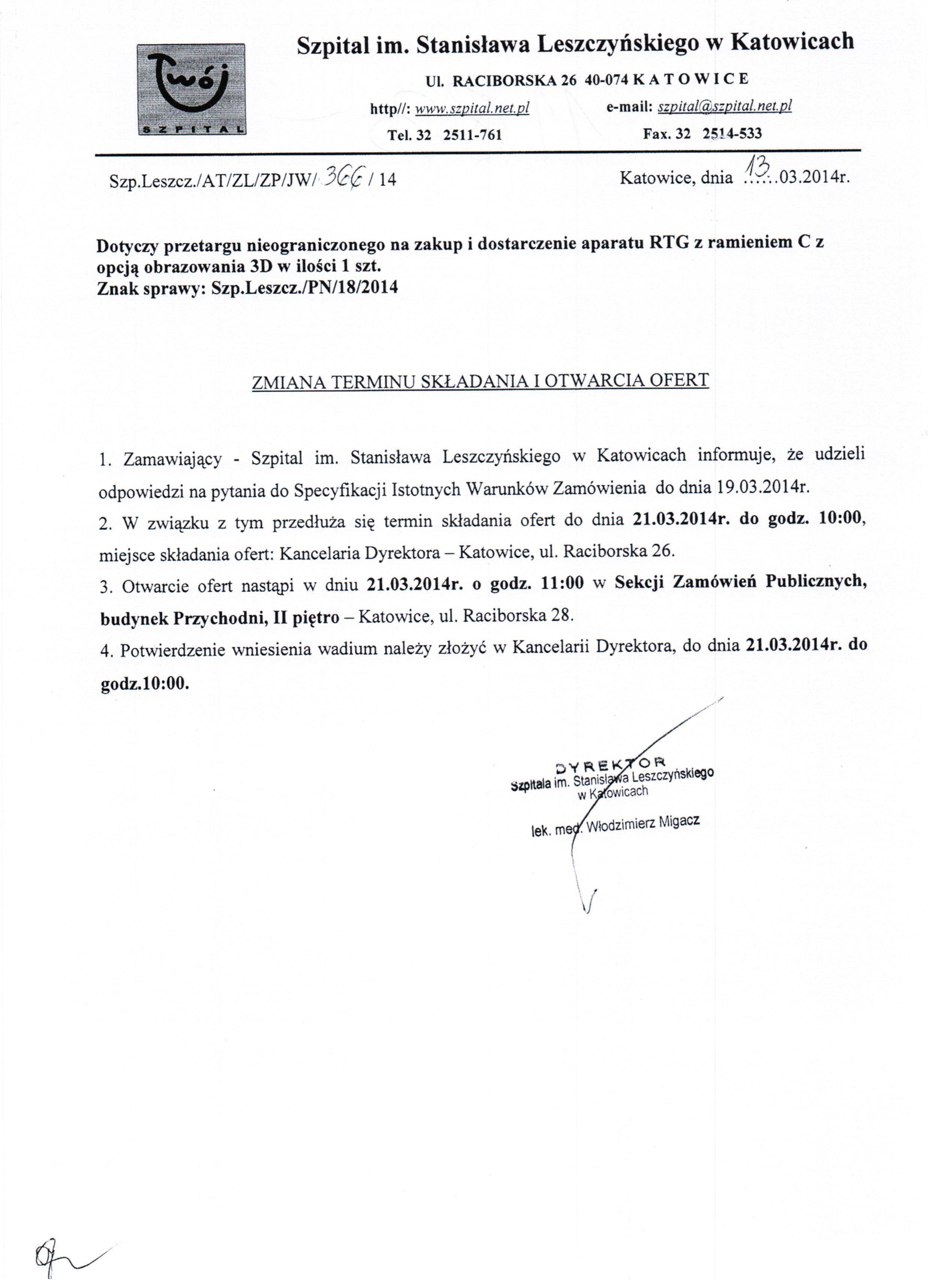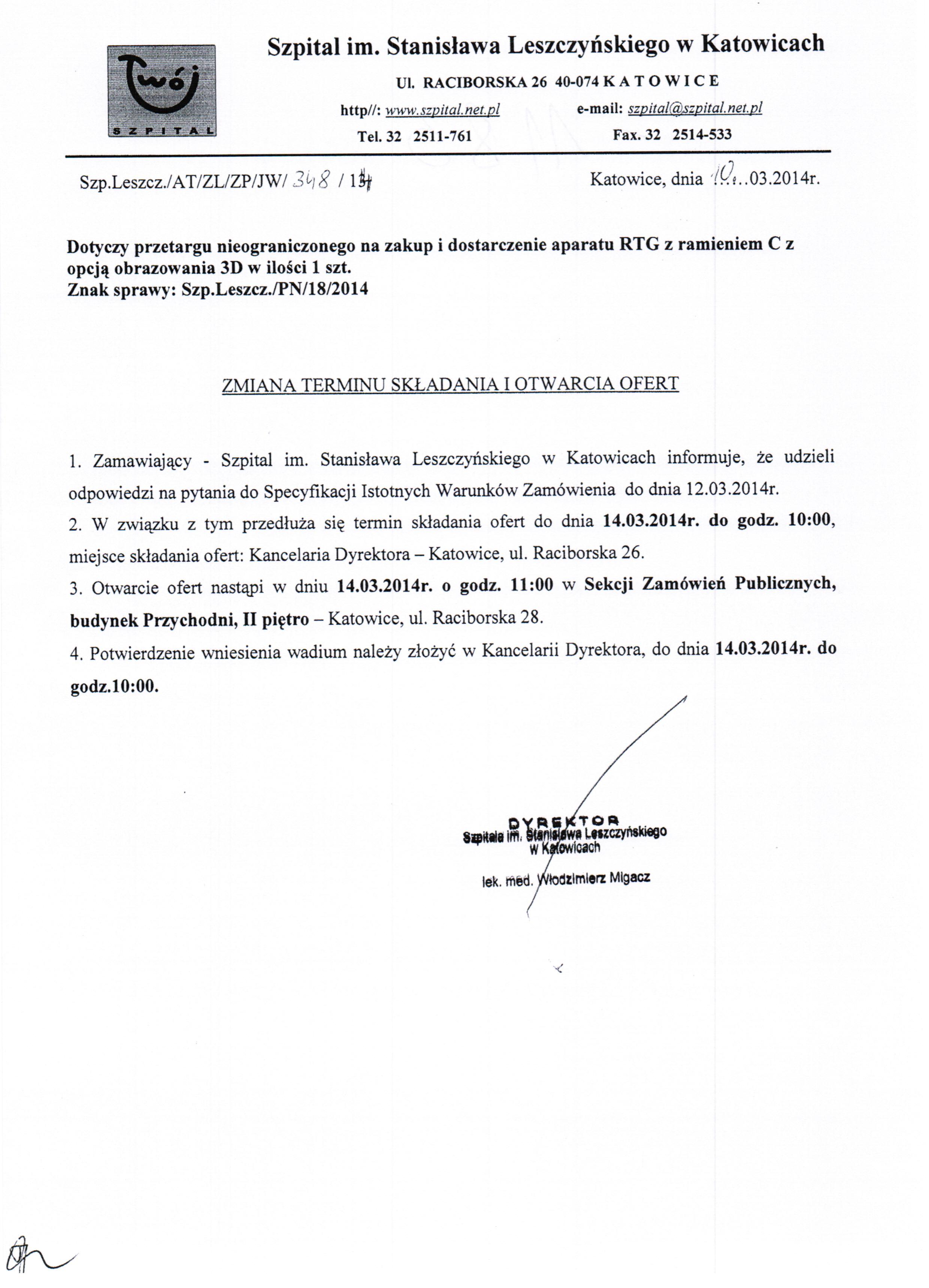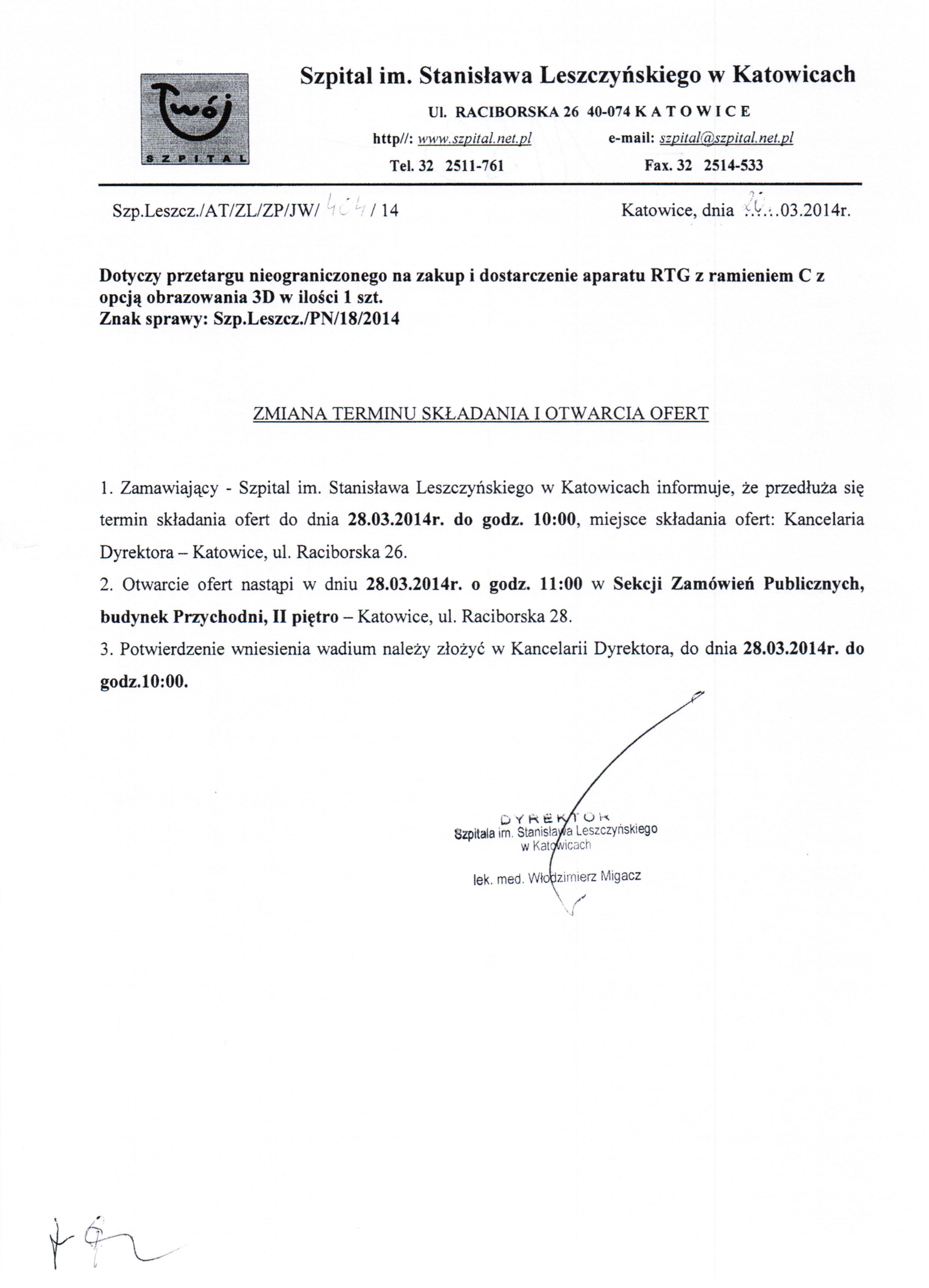 w dniu 4.03.2014r. o godz. 11:00 w 40– 074 Katowice, ulica Raciborska 28, budynek Przychodni, II piętro, Sekcja Zamówień Publicznych.