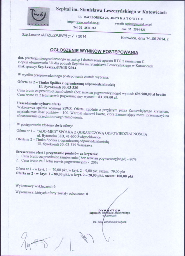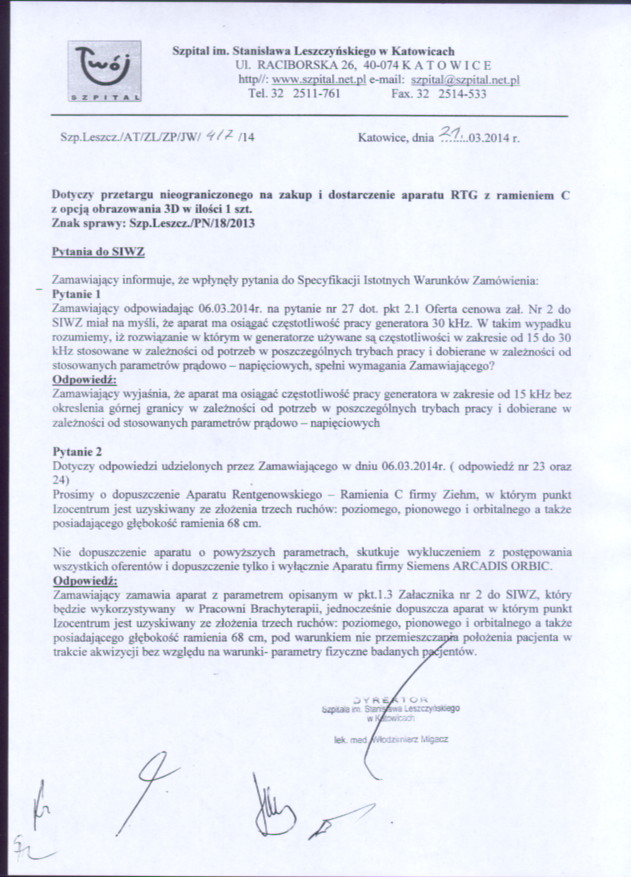 ogłasza przetarg nieograniczony o wartości szacunkowej zamówienia powyżej 14.000 EURO na zakup i dostarczenie aparatu rtg z ramieniem C z opcją obrazowania 3D