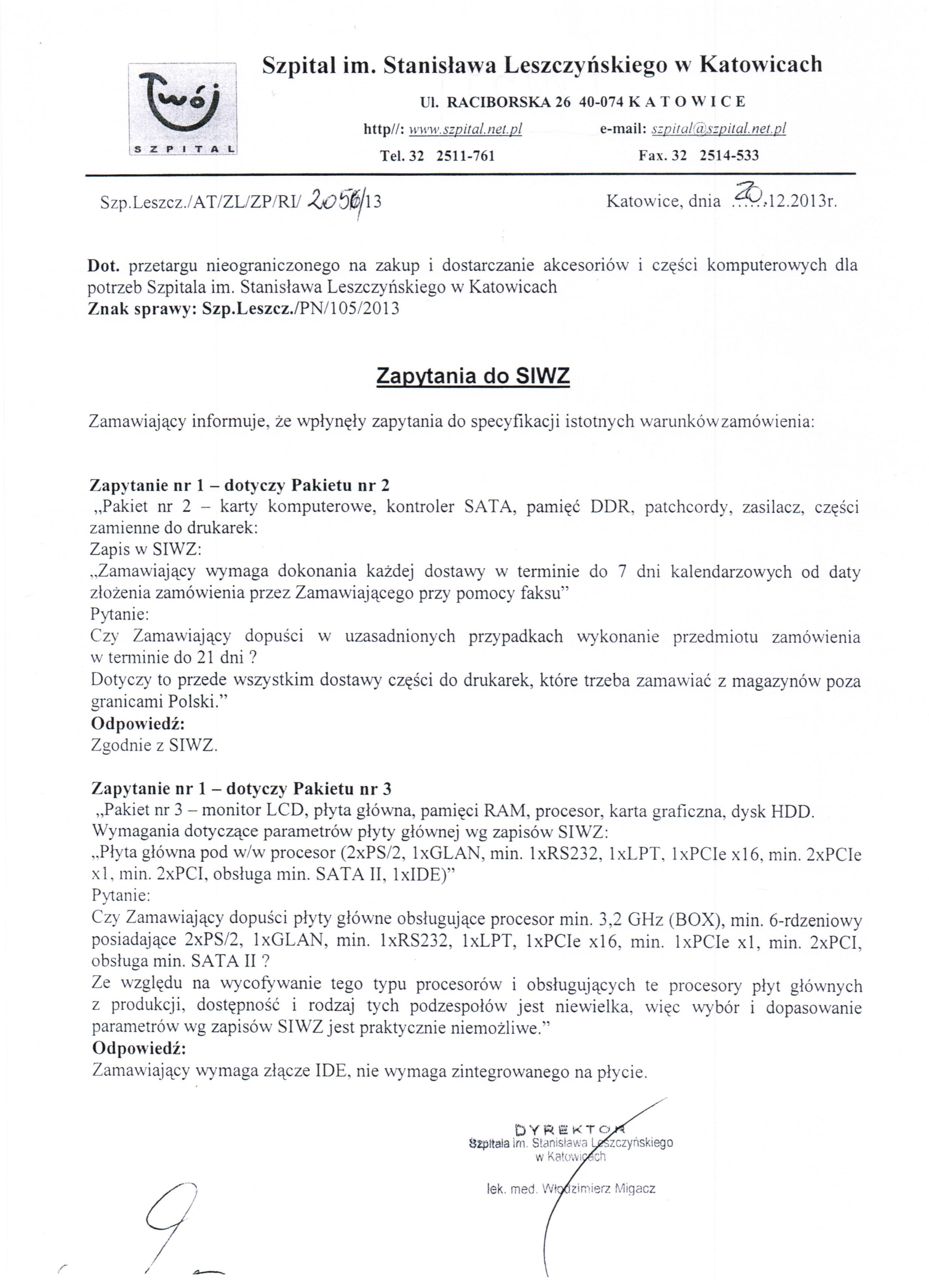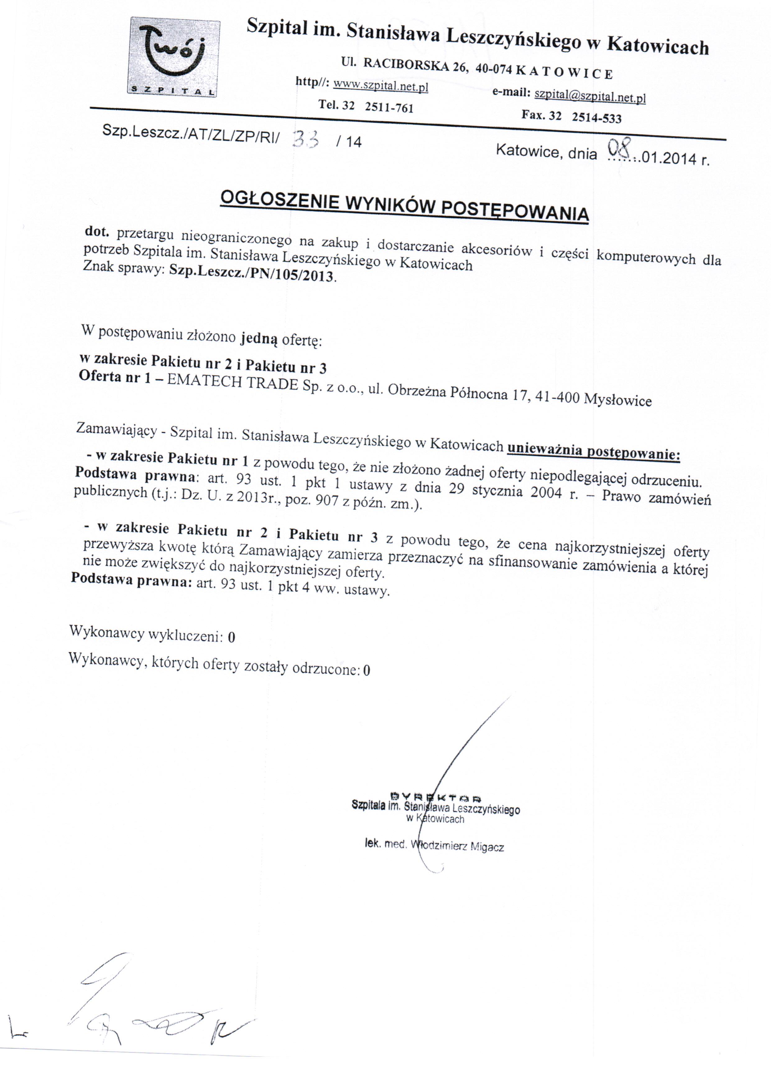 do dnia 23.12.2013 r. do godz. 10:00 w Szpitalu im. Stanisława Leszczyńskiego w Katowicach ul. Raciborska 26 – Kancelaria Dyrektora.