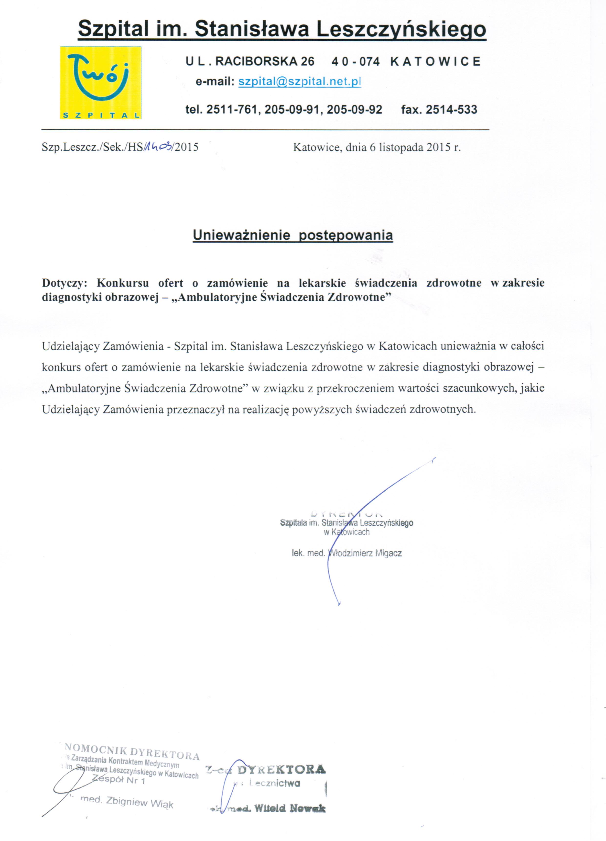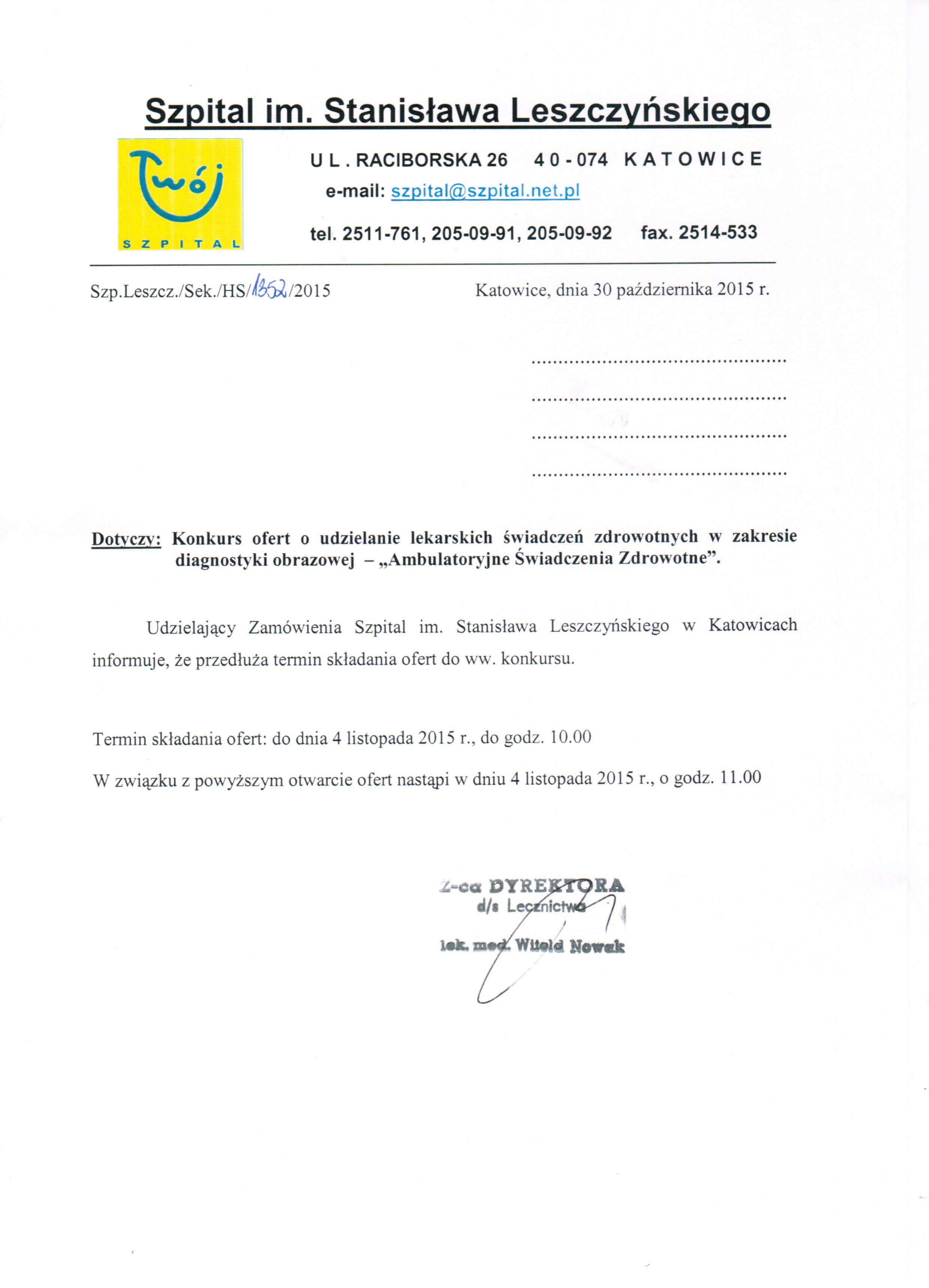 - Otwarcie ofert nastąpi w budynku Dyrekcji Szpitala im. Stanisława Leszczyńskiego, Raciborska 26, I piętro, Sala Konferencyjna w dniu 30.10.2015 r. o godz. 10.00