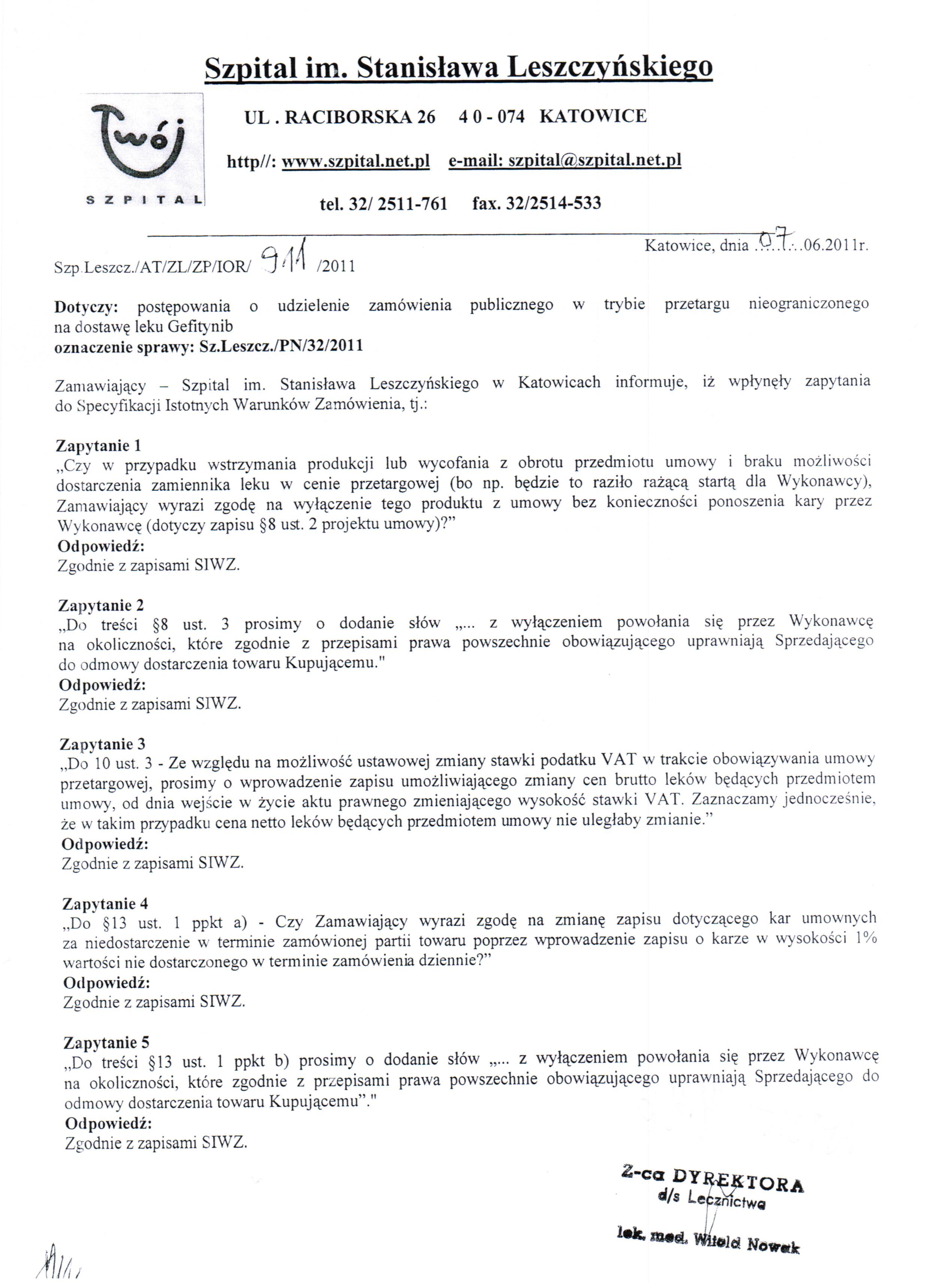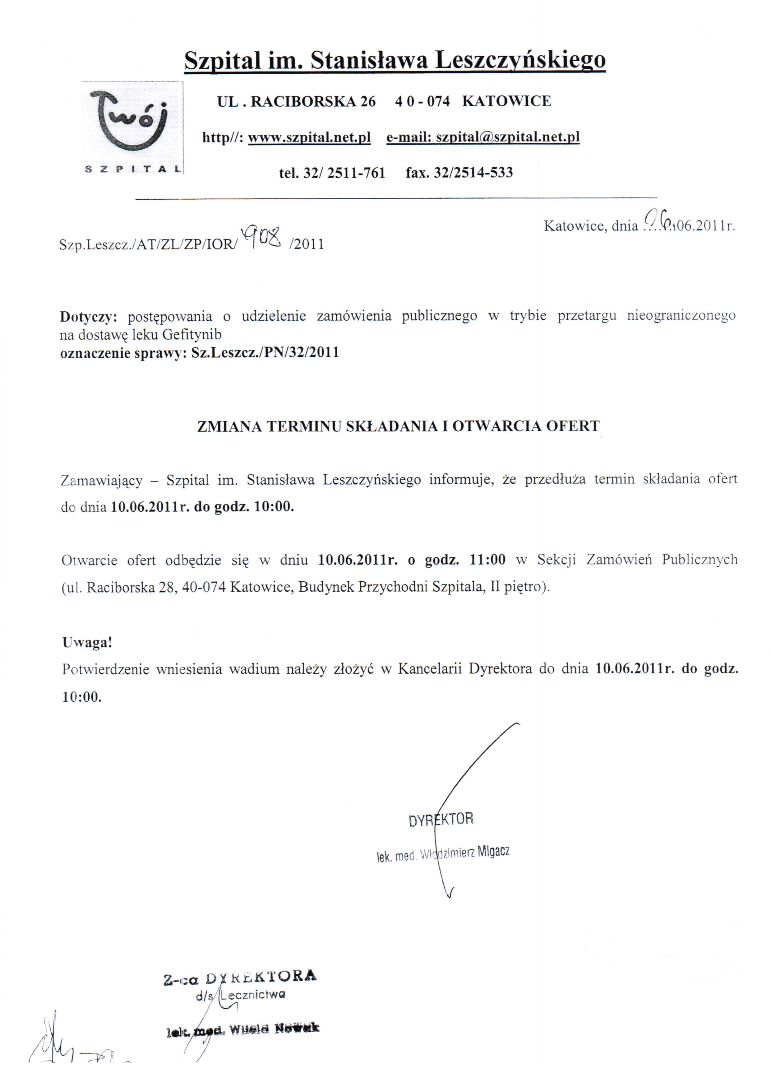 w dniu 08.06.2011r. o godz. 11:00 w 40-074 Katowice, ulica Raciborska 28, budynek Przychodni, II piętro, Sekcja Zamówień Publicznych.