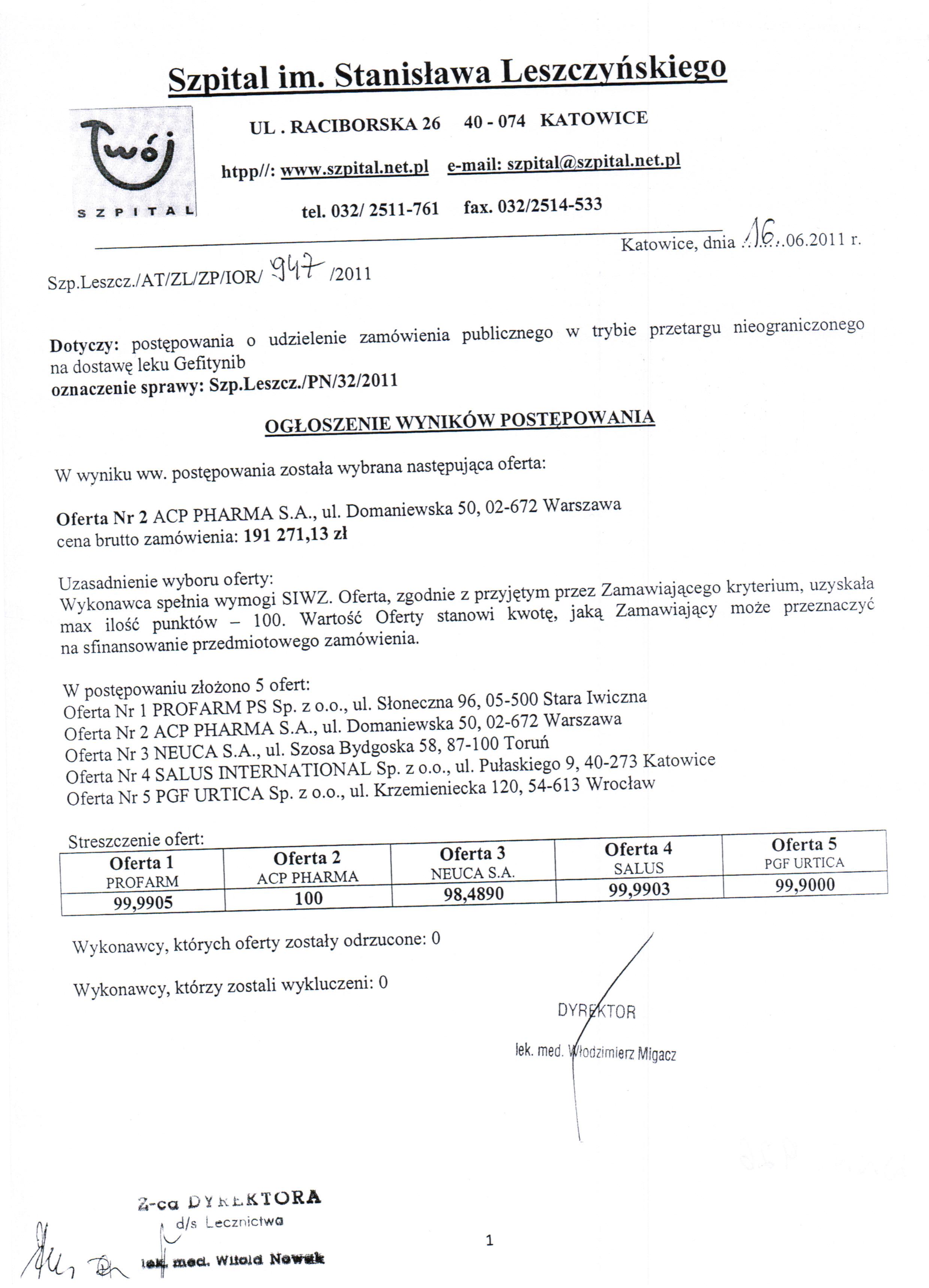 ogłasza przetarg nieograniczony o wartości szacunkowej zamówienia powyżej 14.000 EURO na dostawę leku Gefitynib