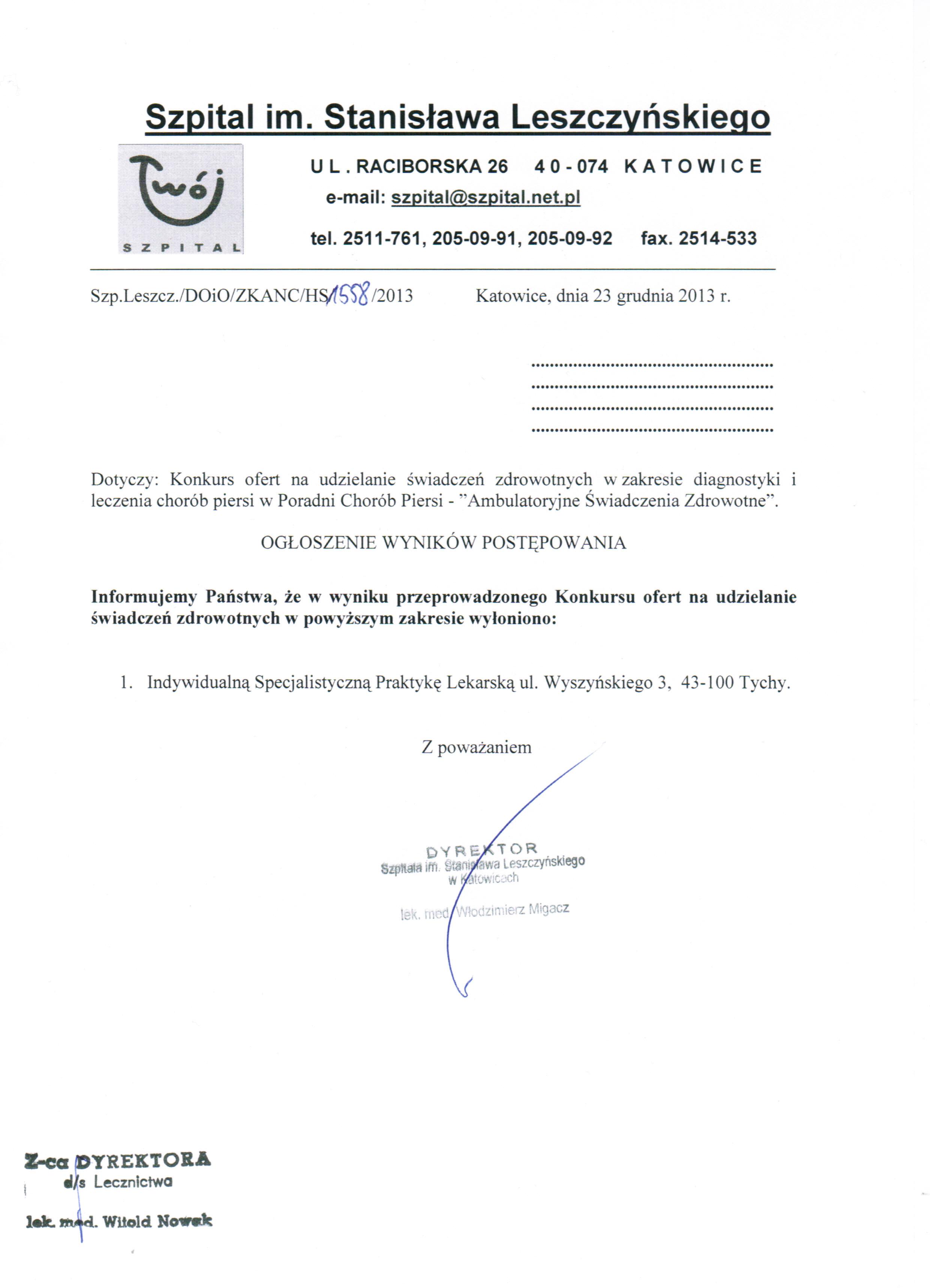 Dodatkowych informacji udziela Z-ca Dyrektora ds. Lecznictwa lek. med. Witold Nowak pod nr tel. (32) 251 17 61.