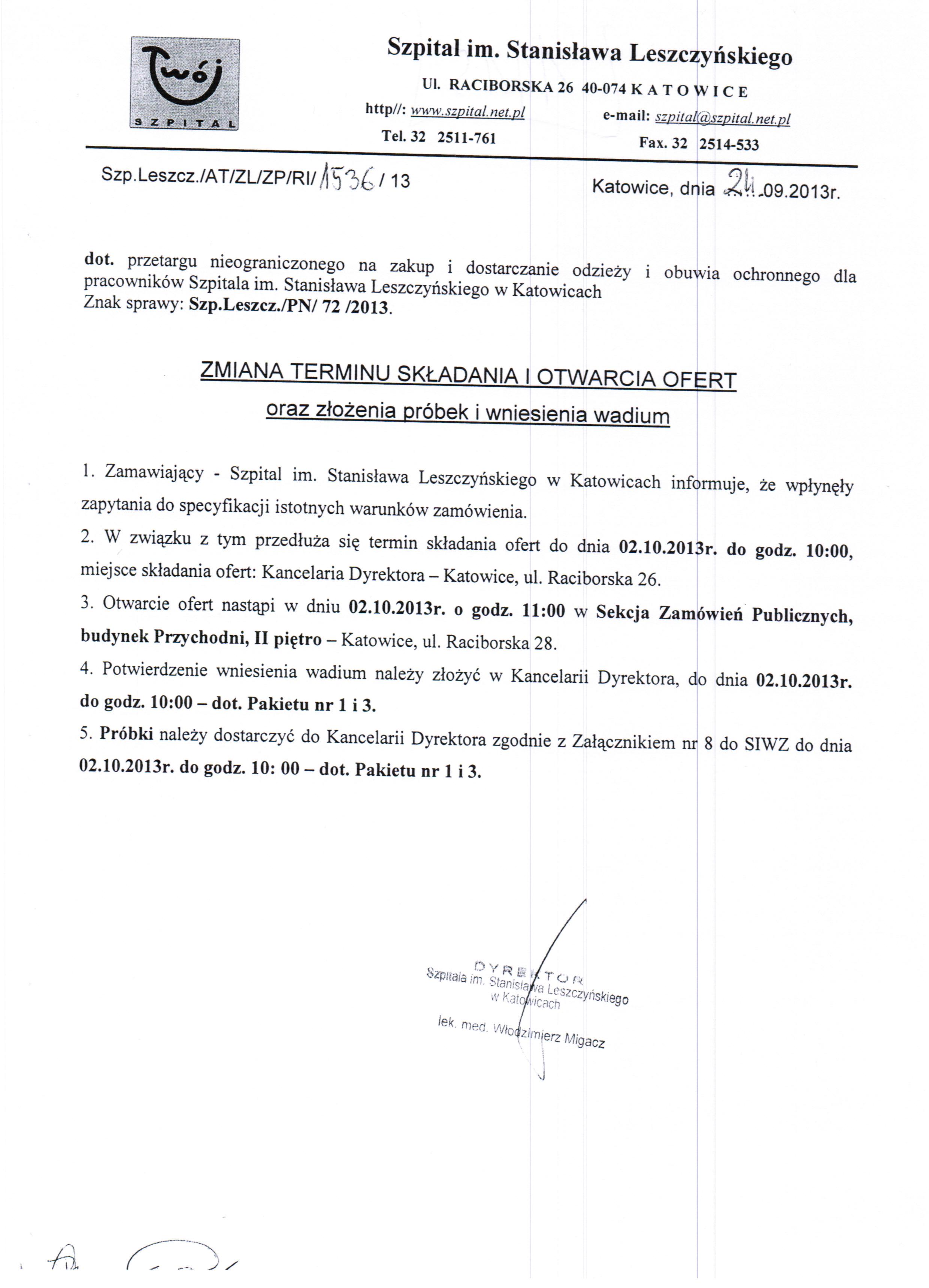 Oferty należy złożyć do dnia 27.09.2013 r. do godz. 10:00 w Szpitalu im. Stanisława Leszczyńskiego w Katowicach ul. Raciborska 26 – Kancelaria Dyrektora.