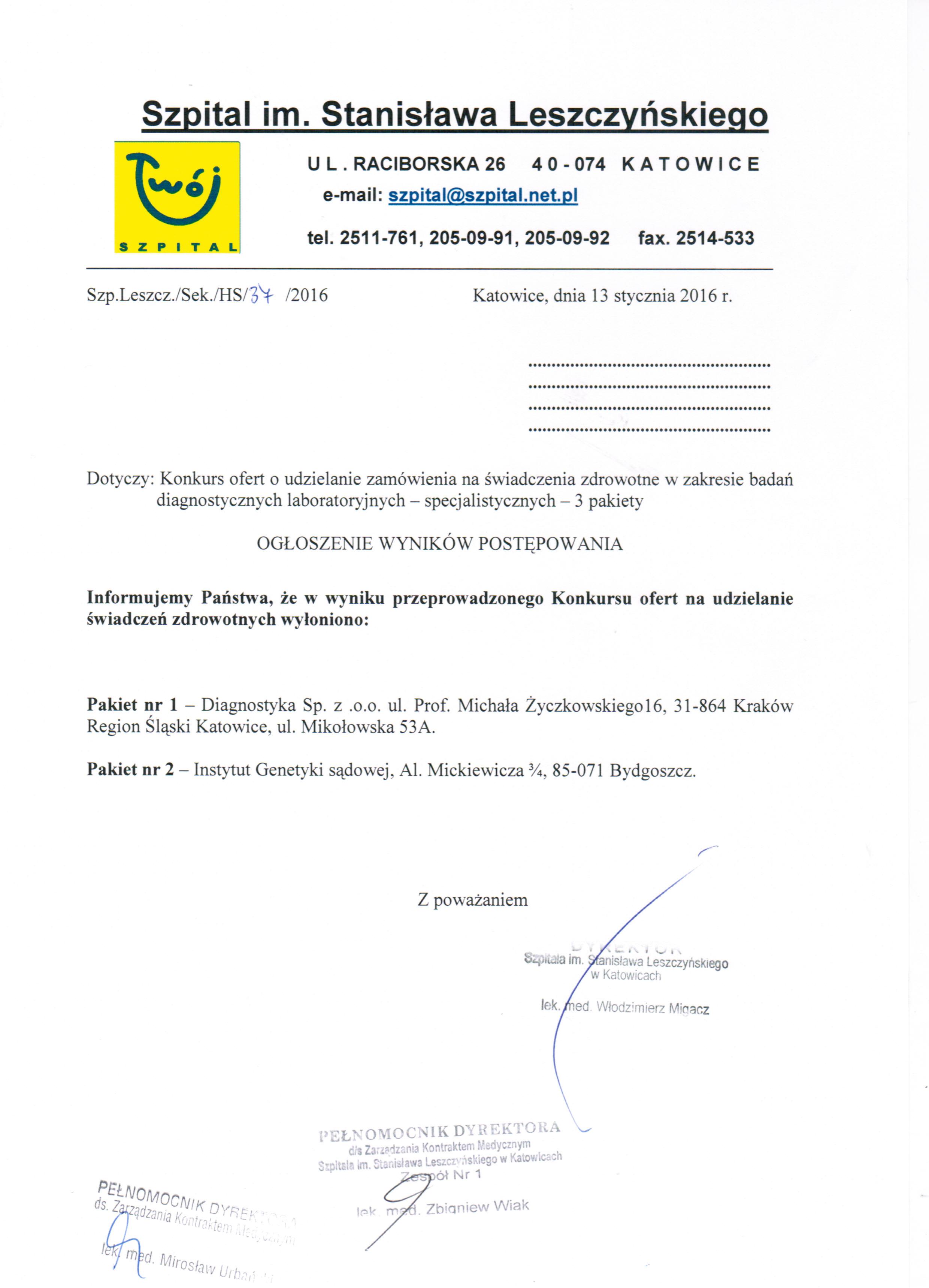 Dodatkowych informacji udziela Z-ca Dyrektora ds. Lecznictwa lek. med. Witold Nowak pod nr tel. (32) 251 17 61.