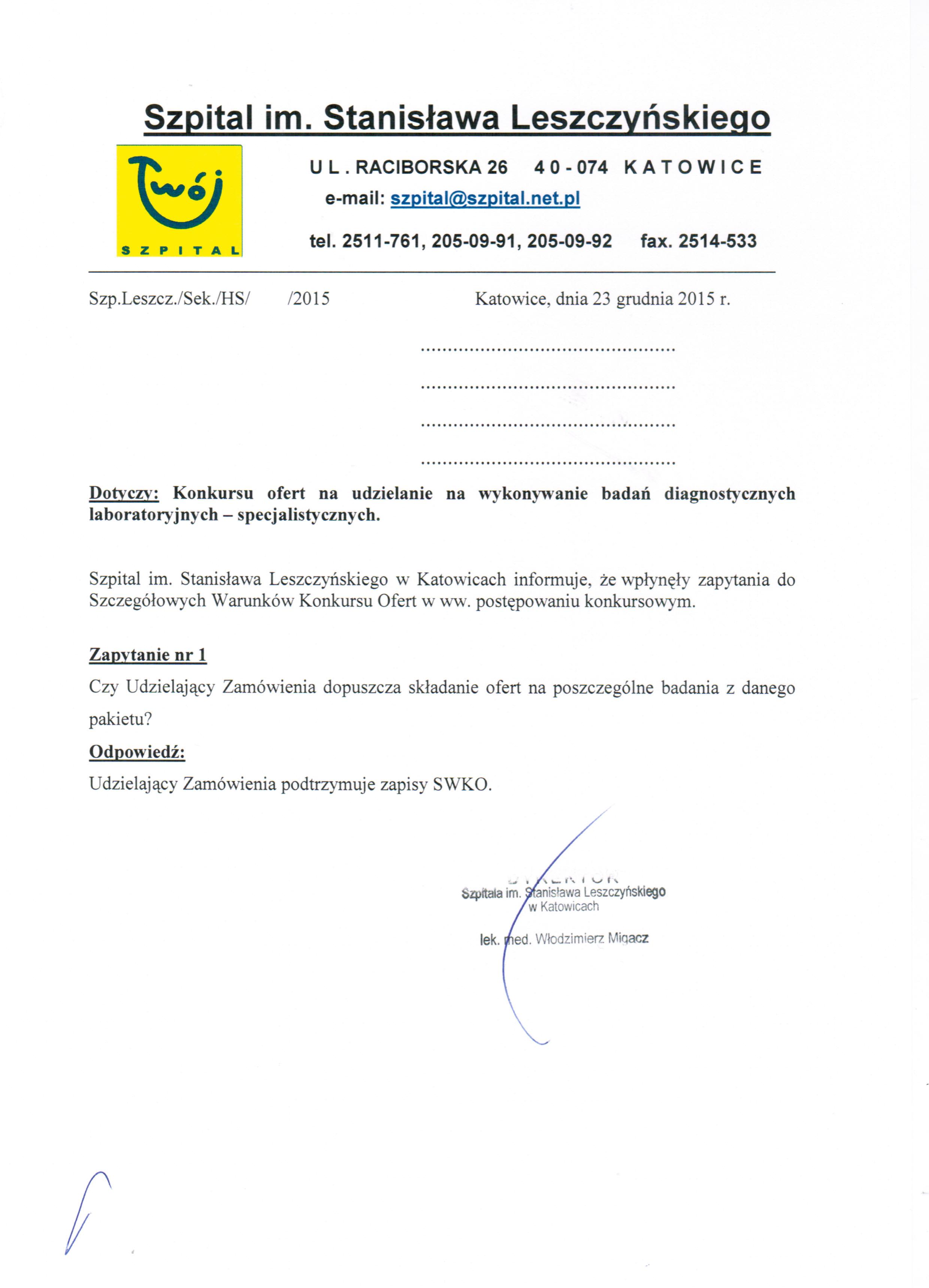 Szpital im. Stanisława Leszczyńskiego w Katowicach ul. Raciborska 26 zwany dalej Udzielającym Zamówienia ogłasza zamówienie na wykonywanie badań diagnostycznych laboratoryjnych – specjalistycznych.