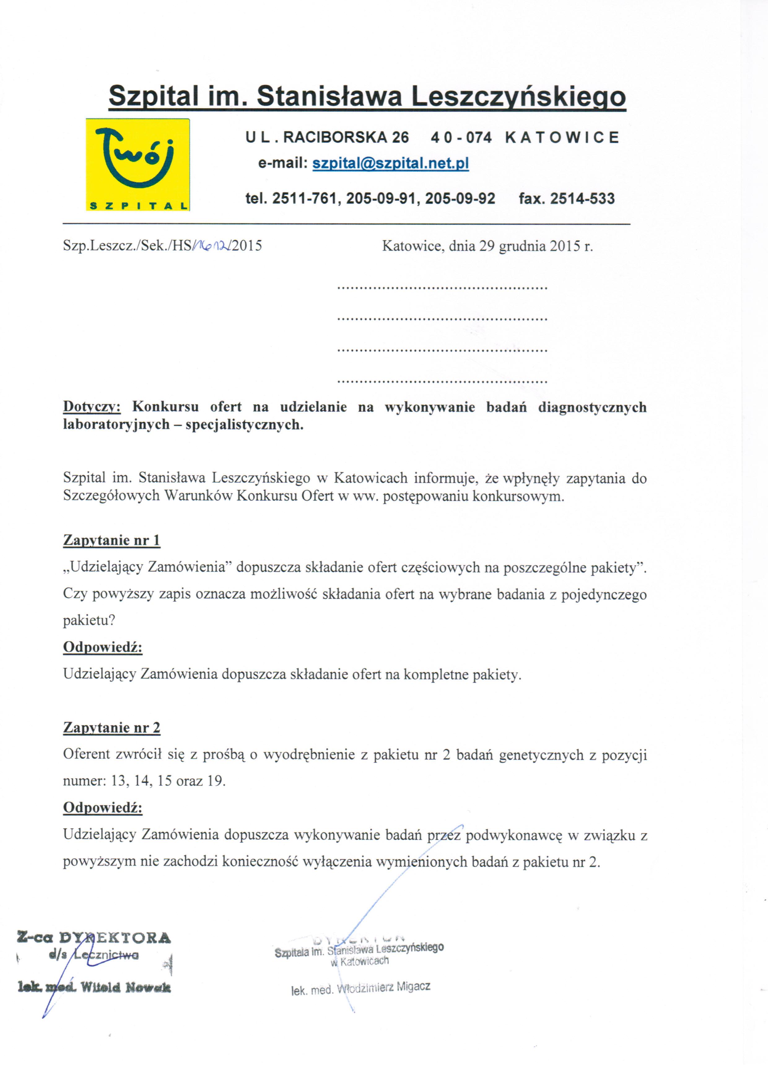 - Otwarcie ofert nastąpi w budynku Dyrekcji Szpitala im. Stanisława Leszczyńskiego, Raciborska 26, I piętro, Sala Konferencyjna w dniu 08.01.2016 r. o godz. 12.00
