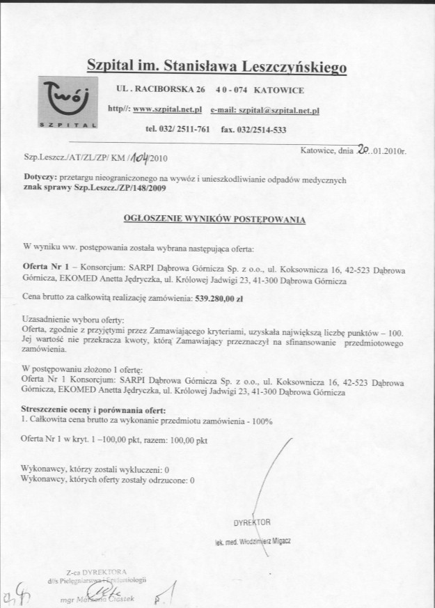 Oferty należy złożyć do dnia 13.01.2010r. do godz. 11.00 w Szpitalu im. Stanisława Leszczyńskiego w Katowicach przy ul. Raciborskiej 26 w Kancelarii Dyrektora.