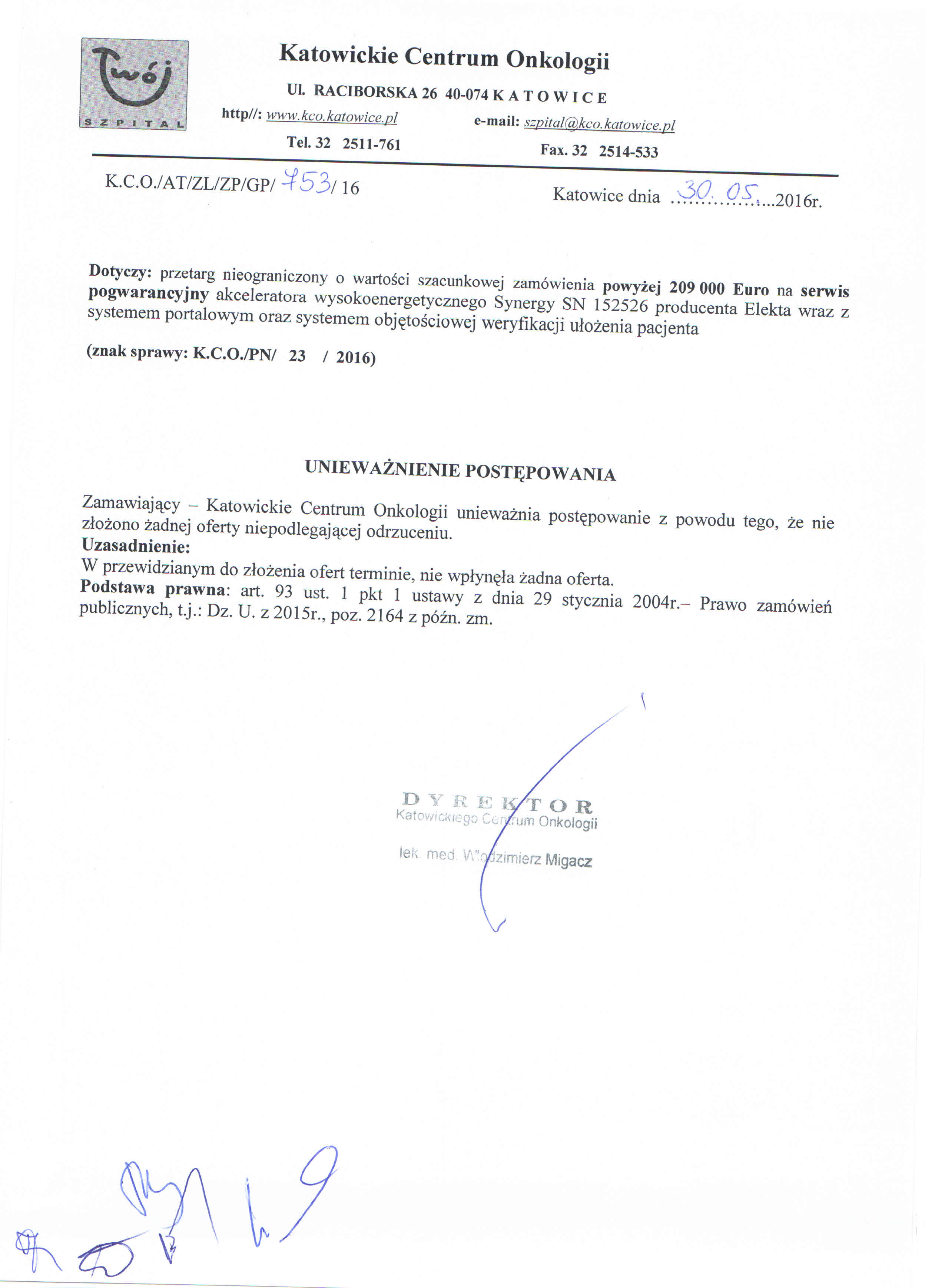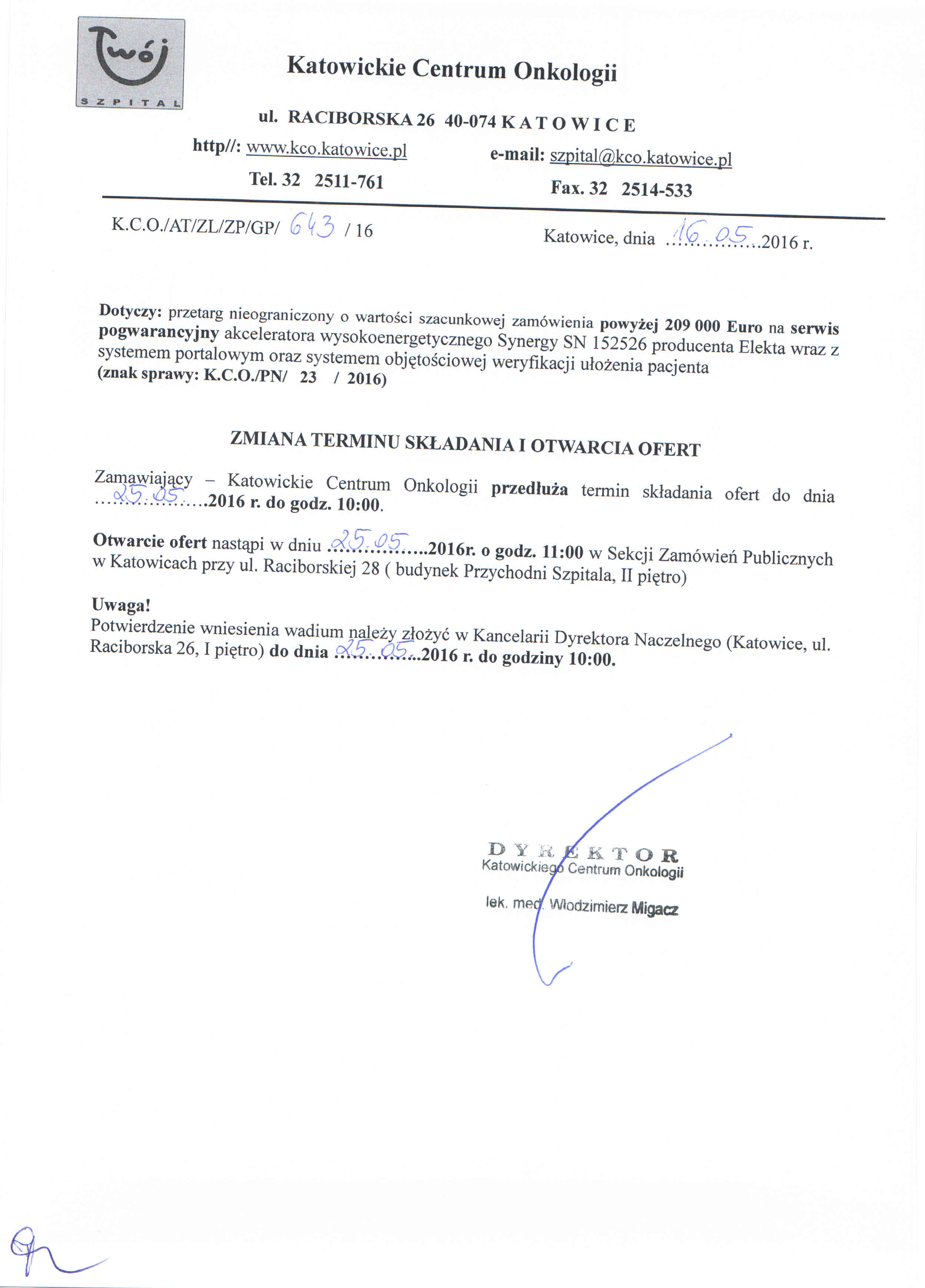 w dniu 18.05.2016r. o godz. 11:00 w Katowickim Centrum Onkologii ul. Raciborska 28, budynek Przychodni, II piętro, Sekcja Zamówień Publicznych.