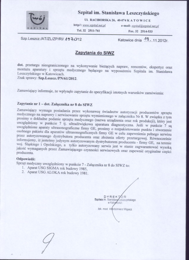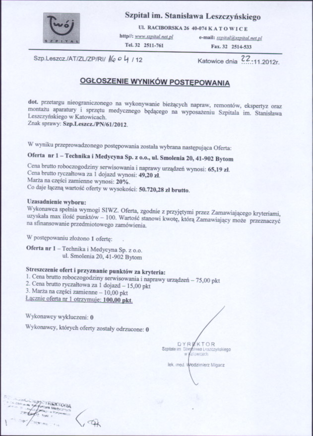 w dniu 21.11.2012r. o godz. 11:00 w Szpitalu im. Stanisława Leszczyńskiego w Katowicach, ul. Raciborska 28, budynek Przychodni, II piętro, Sekcja Zamówień Publicznych.