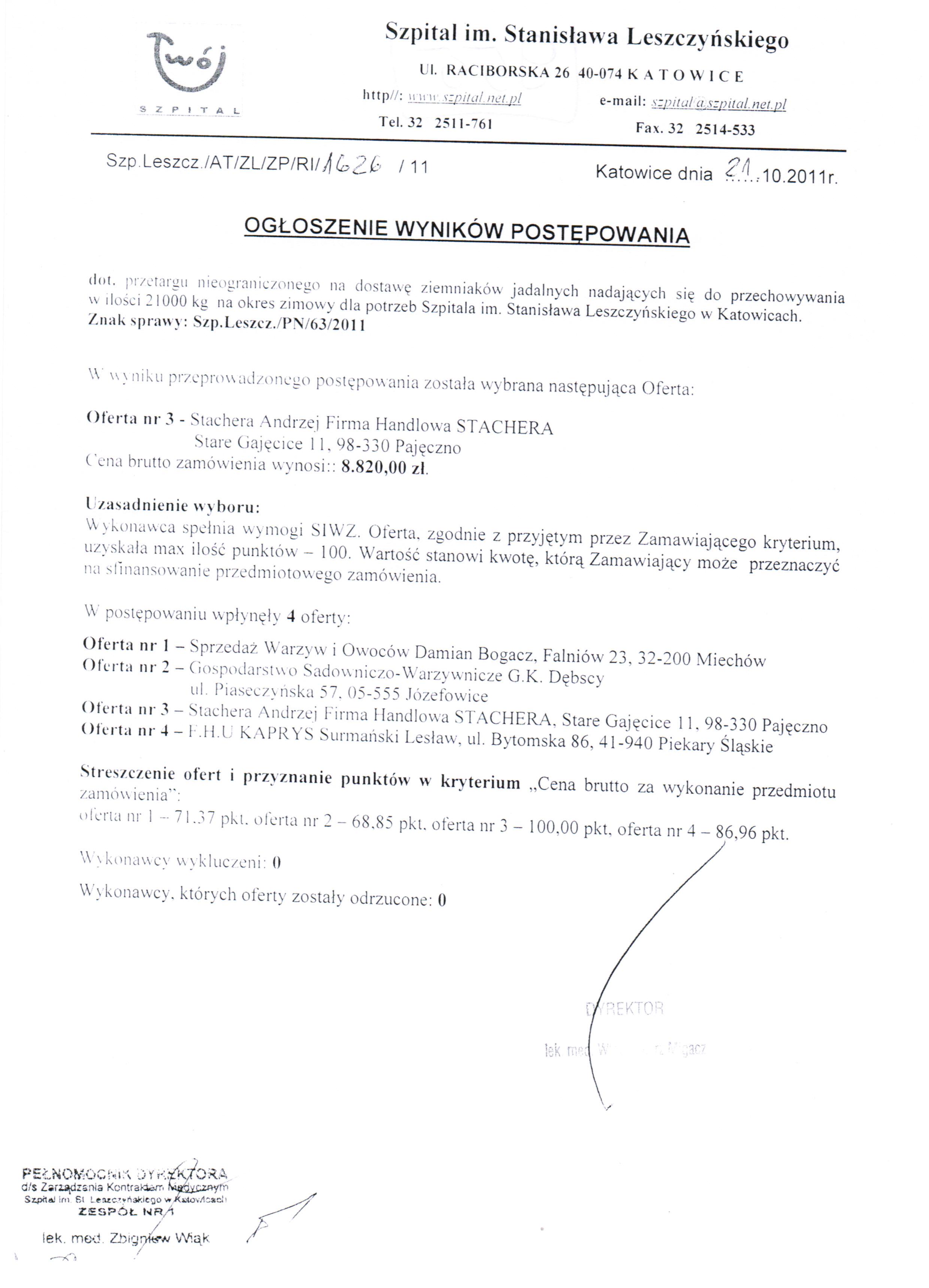 Oferty należy złożyć do dnia 14.10.2011r. do godz. 10:00 w Szpitalu im. Stanisława Leszczyńskiego w Katowicach ul. Raciborska 26 – Kancelaria Dyrektora.