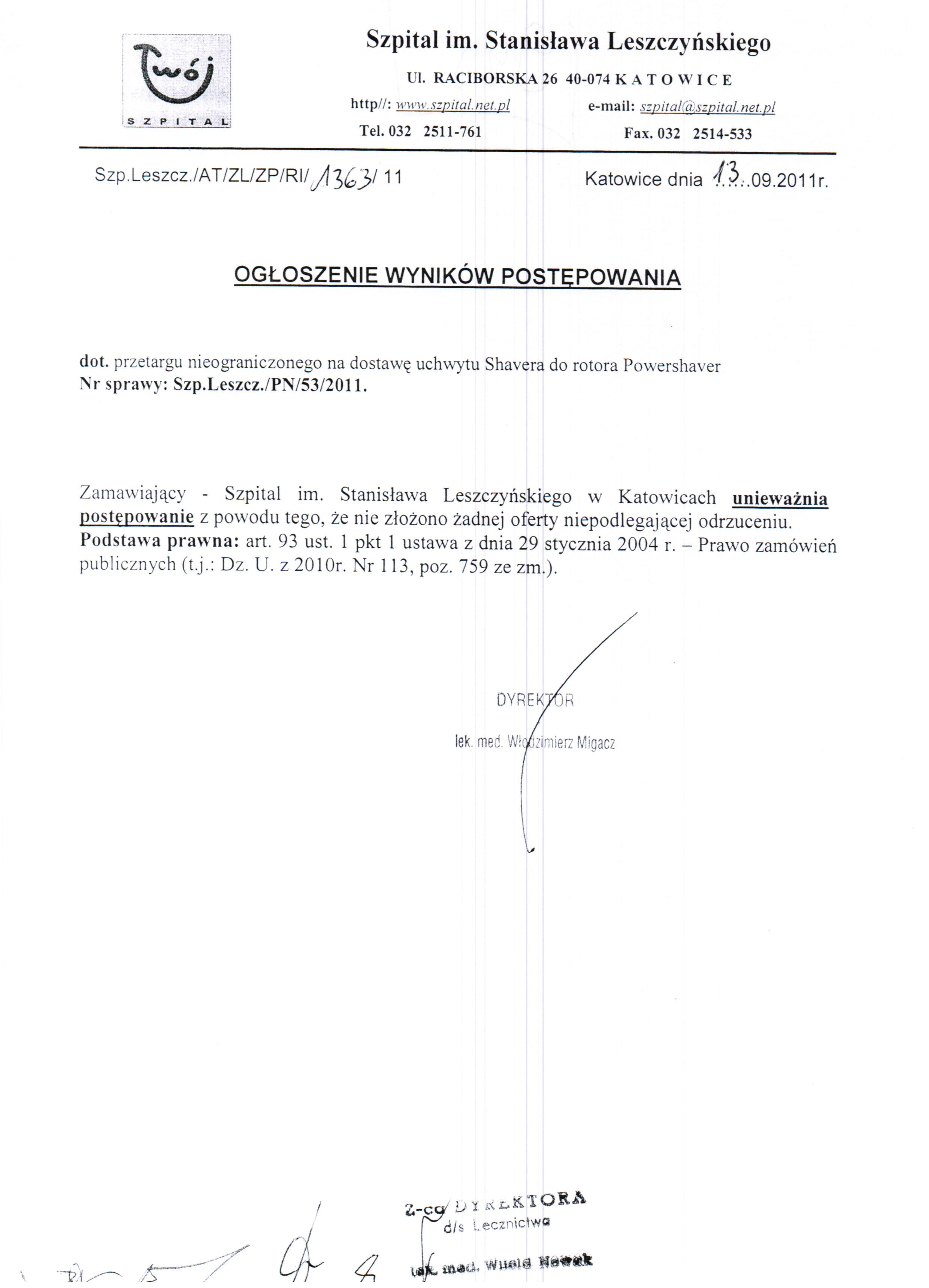 w dniu 08.09.2011r. o godz. 11:00 w Sekcji Zamówień Publicznych w Katowicach przy ul. Raciborskiej 28 (budynek Przychodni Szpitala, II piętro).