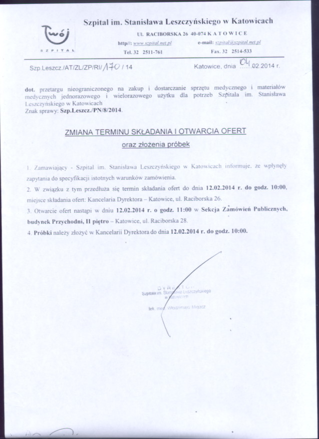 do dnia 06.02.2014 r. do godz. 10:00 w Szpitalu im. Stanisława Leszczyńskiego w Katowicach, ul. Raciborska 26 – Kancelaria Dyrektora.