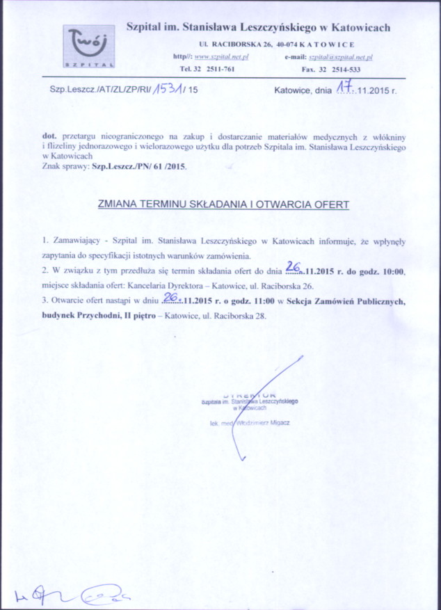 do dnia 20.11.2015 r. do godz. 10:00 w Szpitalu im. Stanisława Leszczyńskiego w Katowicach, ul. Raciborska 26 – Kancelaria Dyrektora.