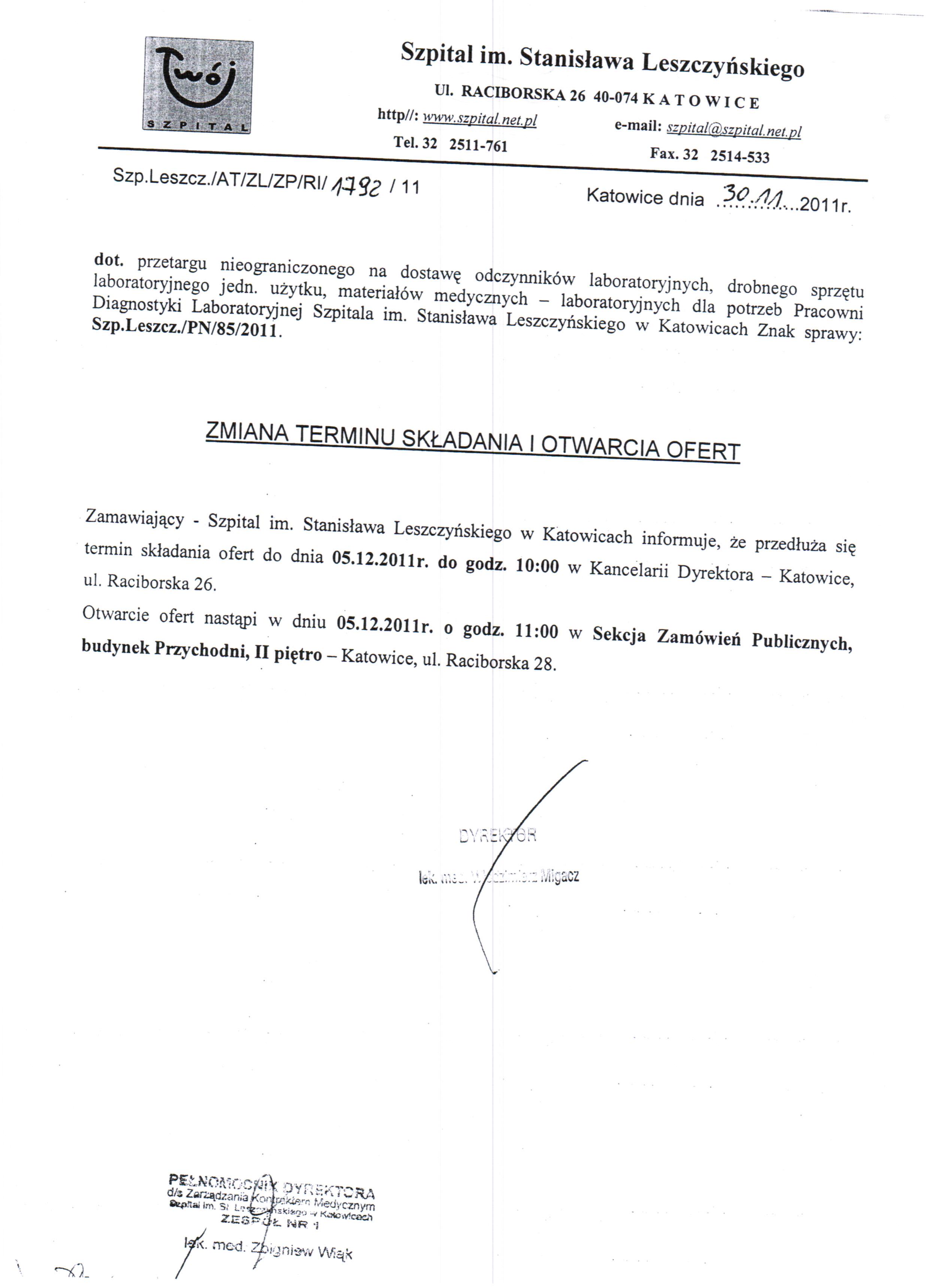 do dnia 02.12.2011r. do godz. 10:00 w Szpitalu im. Stanisława Leszczyńskiego w Katowicach ul. Raciborska 26 – Kancelaria Dyrektora.