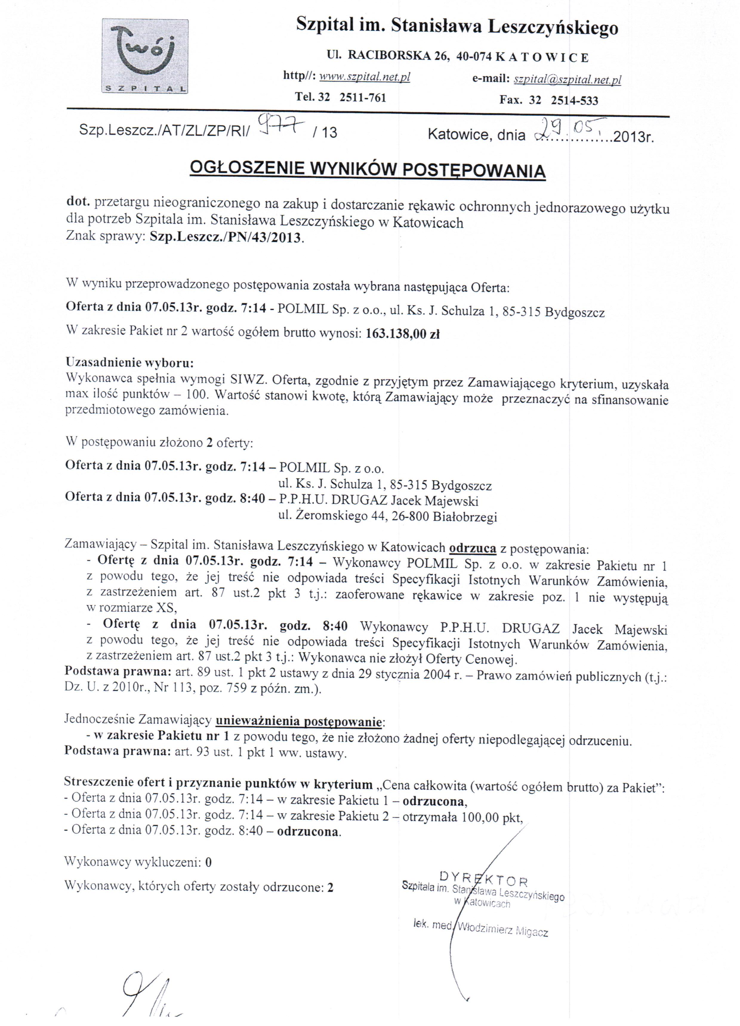 w dniu 30.04.2013 r. o godz. 11:30 w Szpitalu im. Stanisława Leszczyńskiego w Katowicach ul. Raciborska 28, budynek Przychodni, II piętro, Sekcja Zamówień Publicznych.