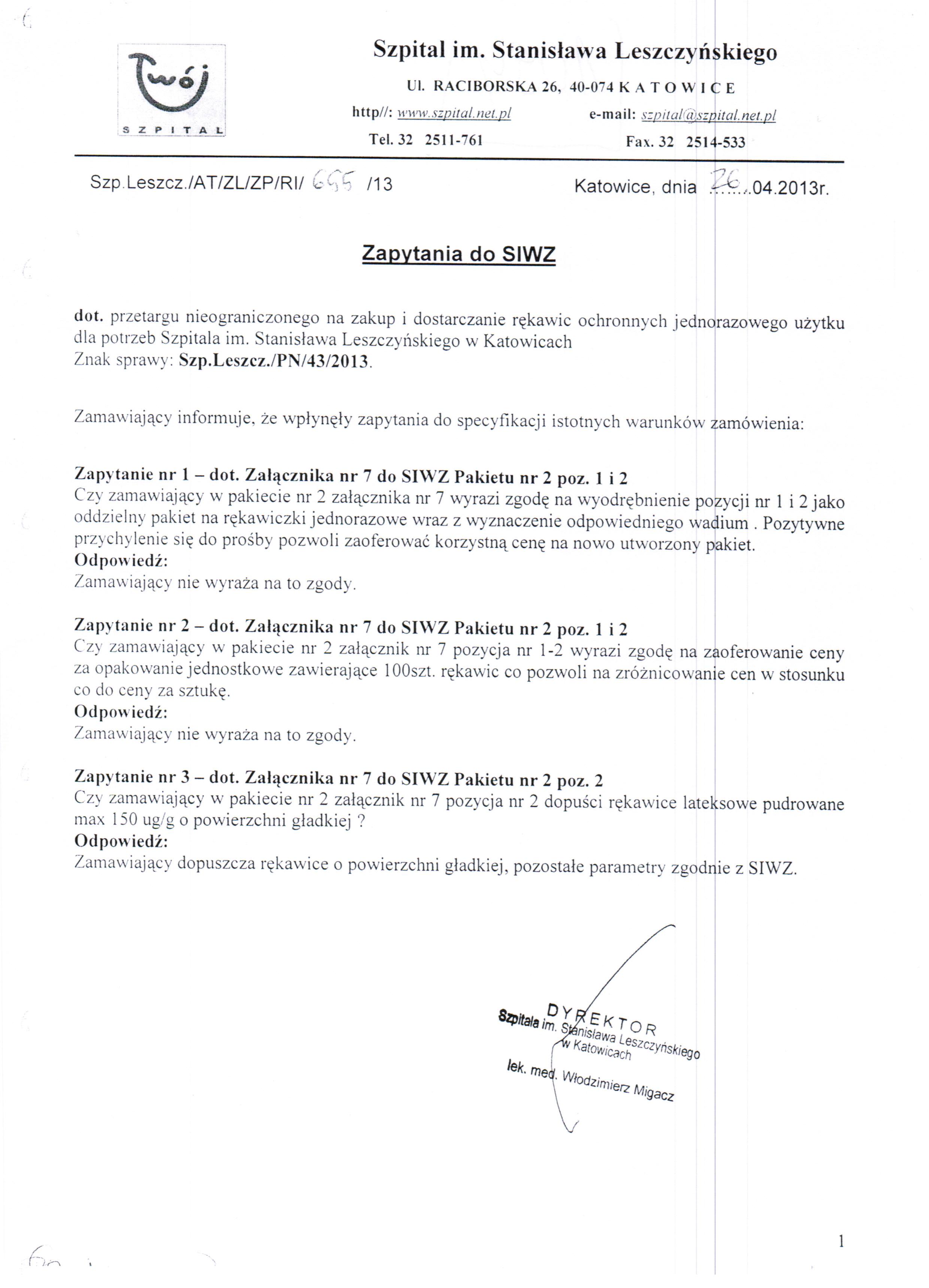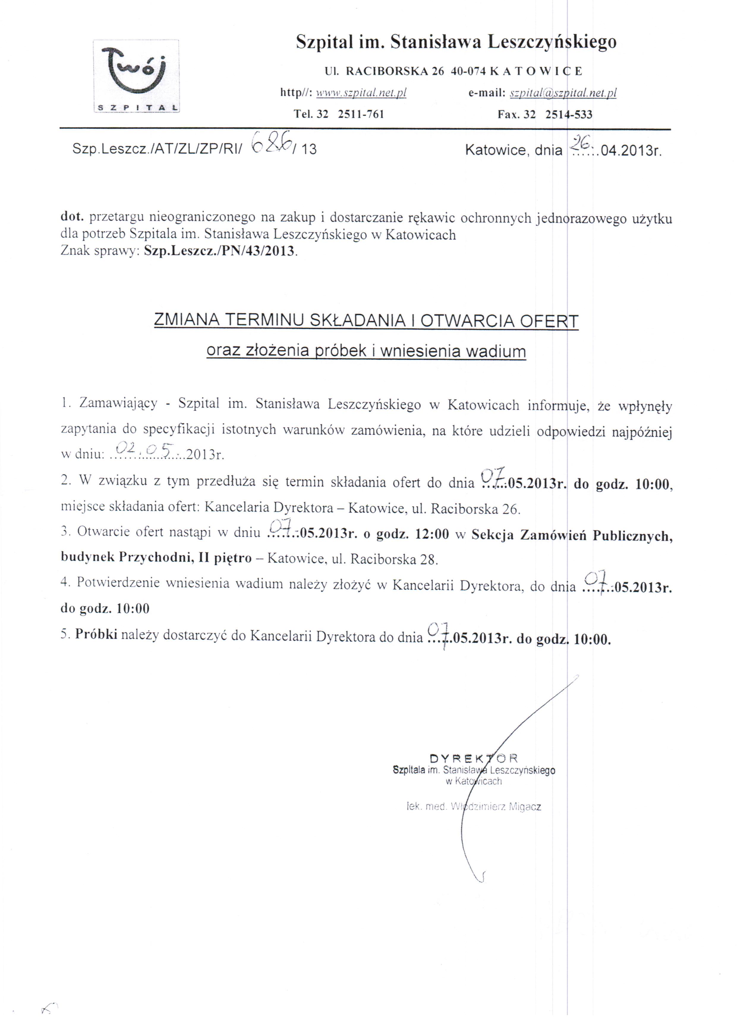 do dnia 30.04.2013 r. do godz. 10:00 w Szpitalu im. Stanisława Leszczyńskiego w Katowicach ul. Raciborska 26 – Kancelaria Dyrektora.