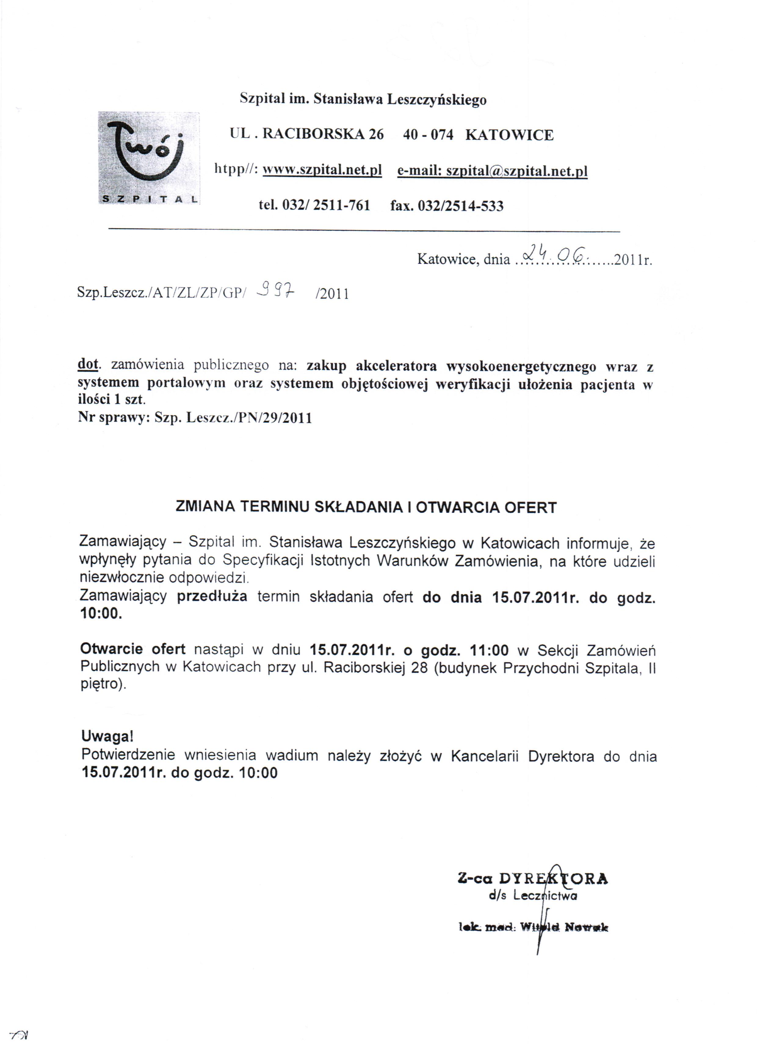 w dniu 28.06.2011r. o godz. 11:00 w Sekcji Zamówień Publicznych w Katowicach przy ul. Raciborskiej 28 (budynek Przychodni Szpitala, II piętro).