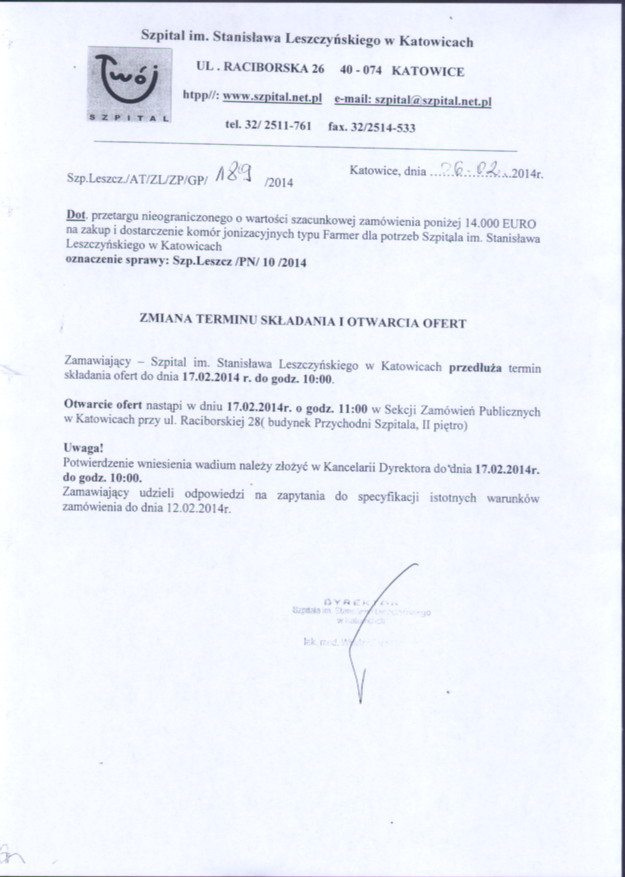 w dniu 10.02.2014 r. o godz. 11:00 w 40-074 Katowice, ulica Raciborska 28, budynek Przychodni, II piętro, Sekcja Zamówień Publicznych.