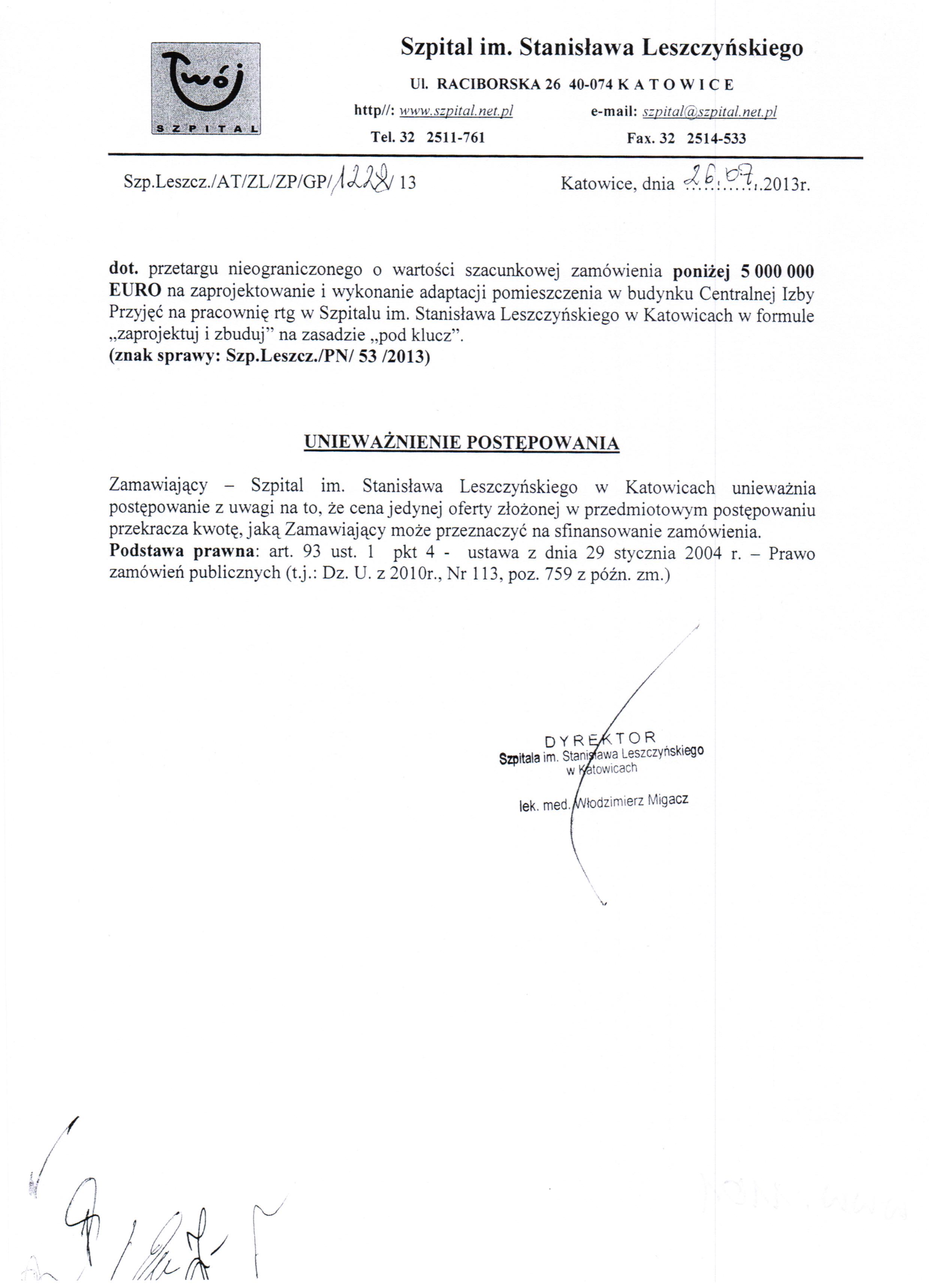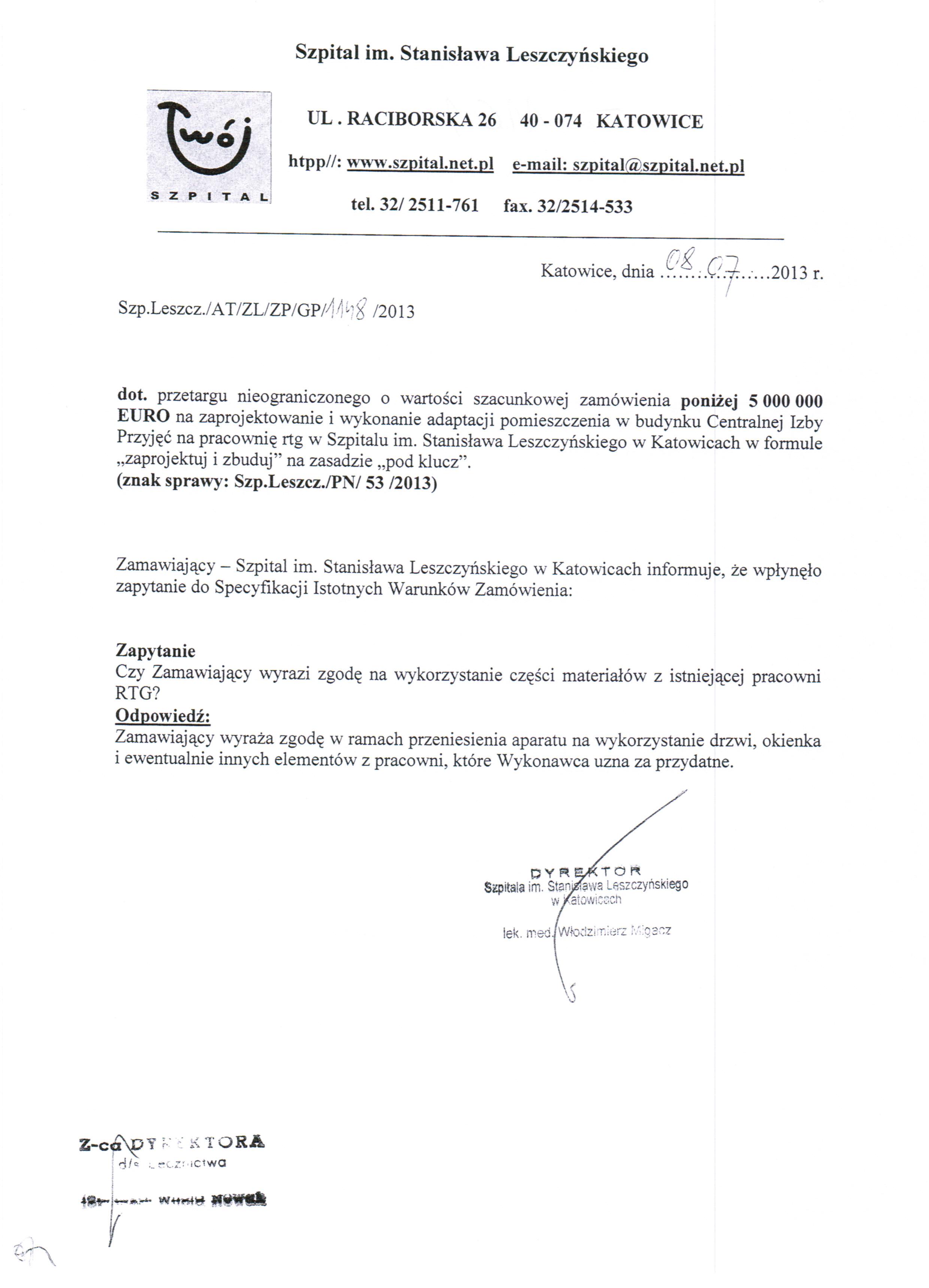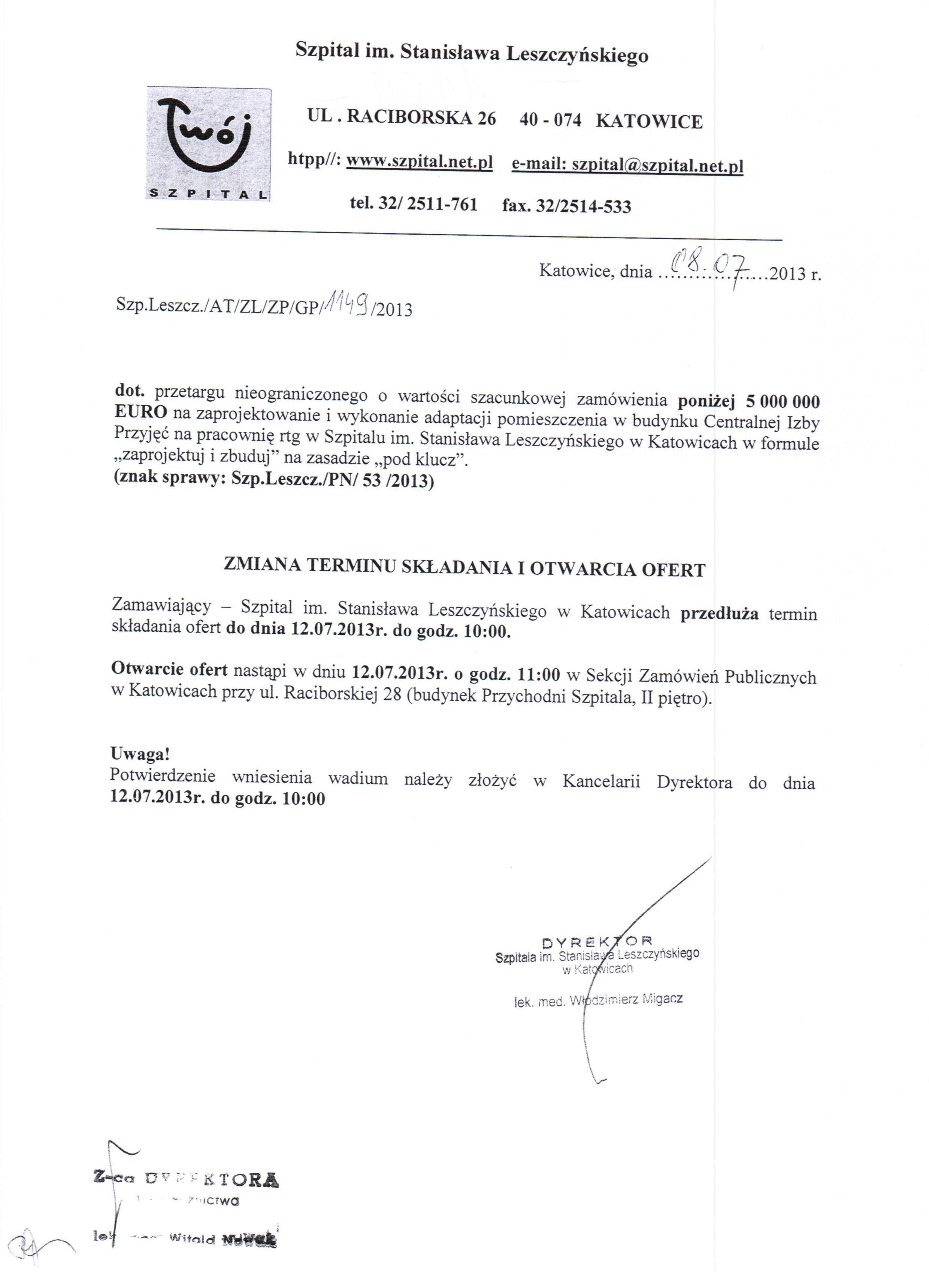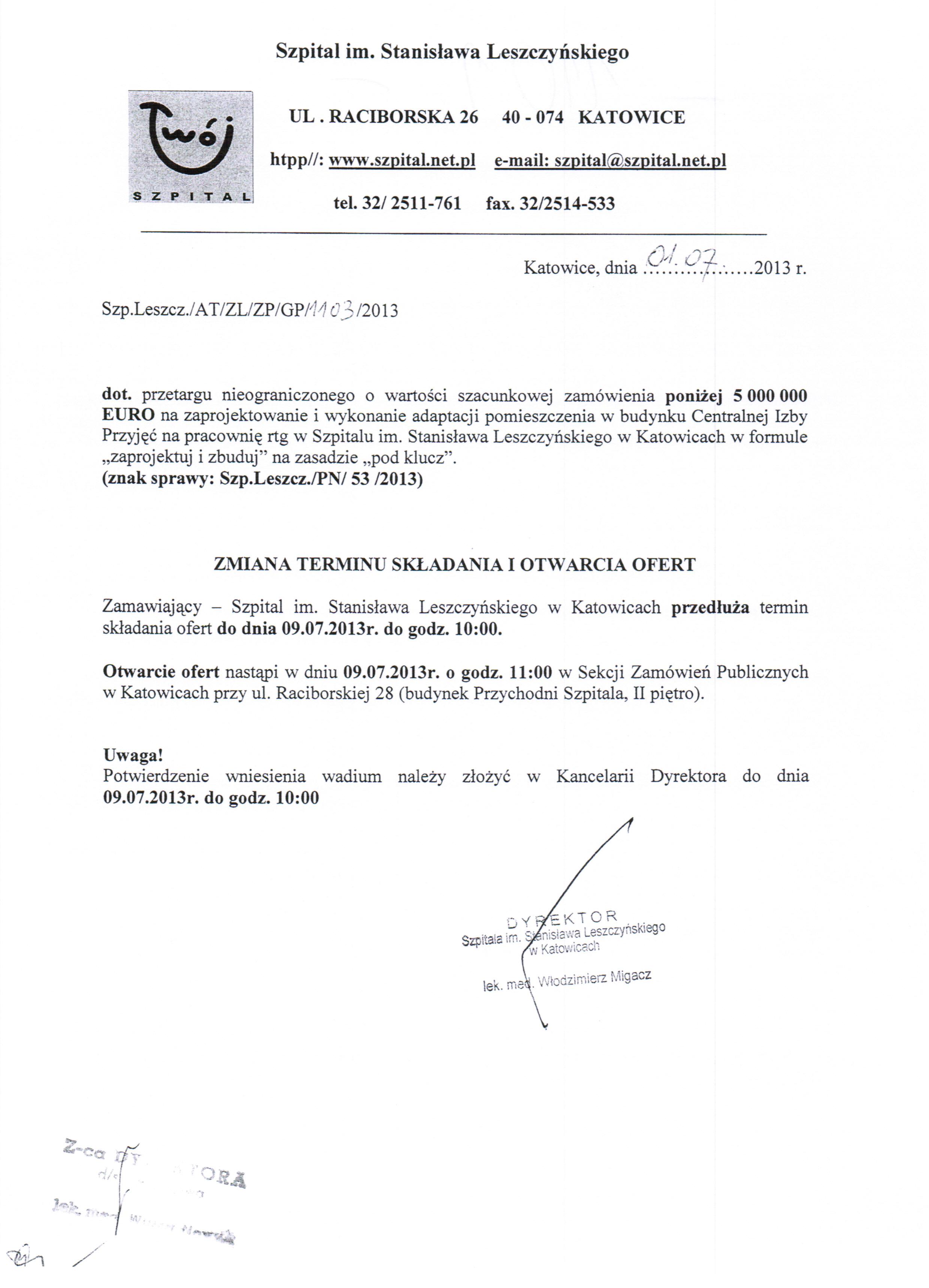 w dniu 02.07.2013r. o godz. 11:00 w Szpitalu im. Stanisława Leszczyńskiego w Katowicach ul. Raciborska 28, budynek Przychodni, II piętro, Sekcja Zamówień Publicznych.
