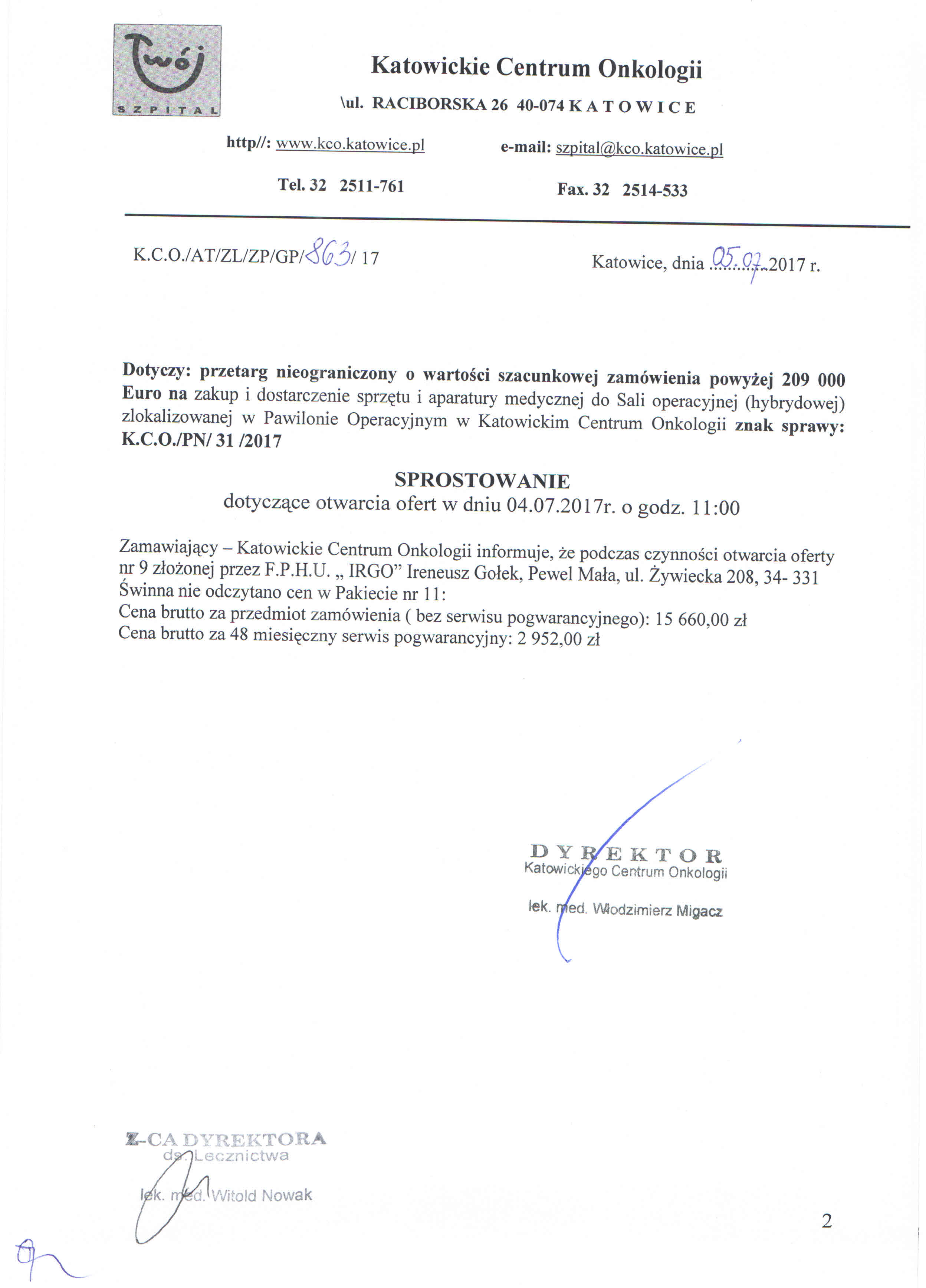 zakup i dostarczenie sprzętu i aparatury medycznej do Sali operacyjnej (hybrydowej) zlokalizowanej w Pawilonie Operacyjnym w Katowickim Centrum Onkologii