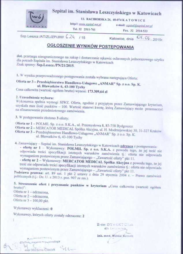 w dniu 22.04.2015 r. o godz. 11:00 w Szpitalu im. Stanisława Leszczyńskiego w Katowicach, ul. Raciborska 28, budynek Przychodni, II piętro, Sekcja Zamówień Publicznych.