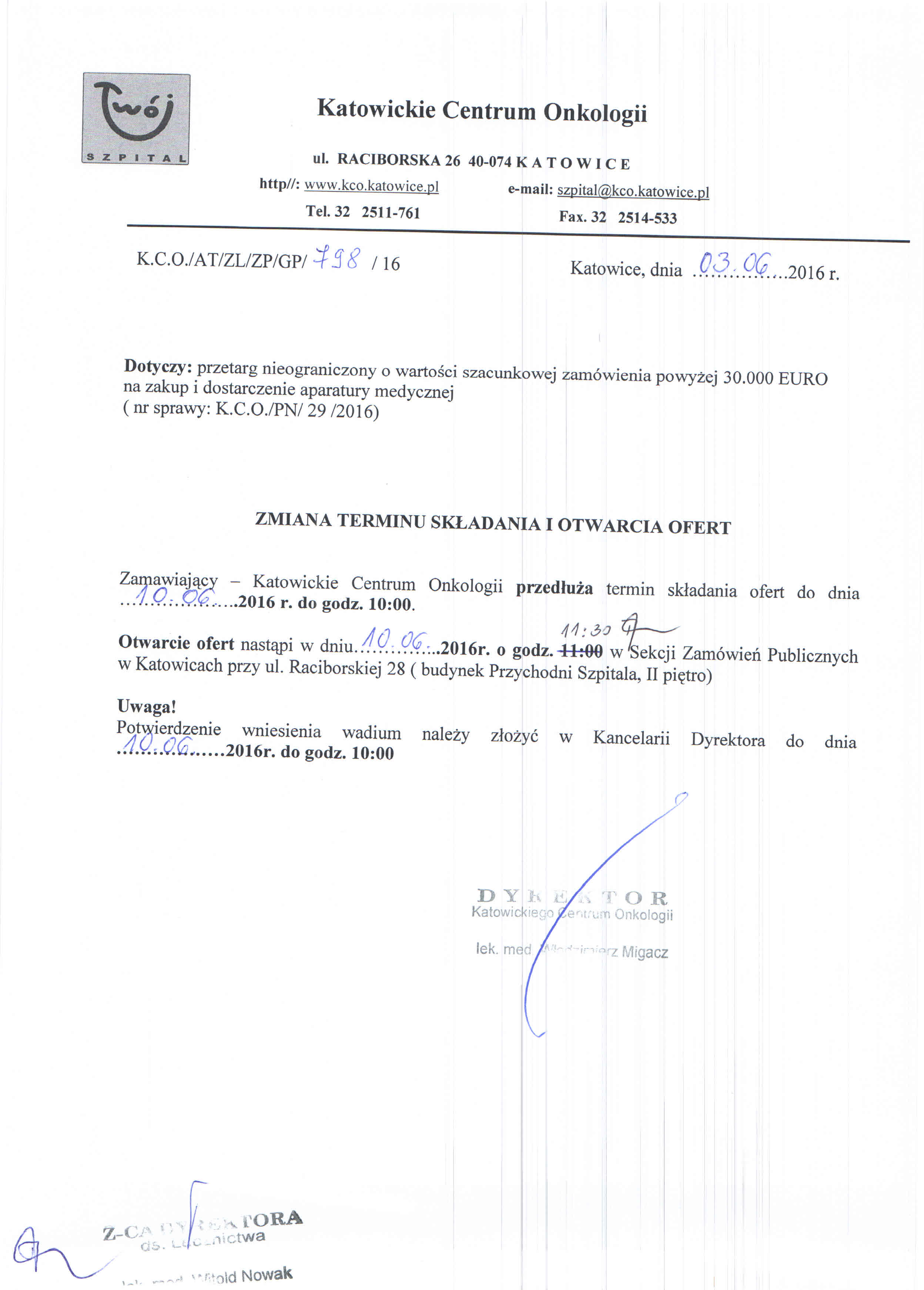 w dniu 08.06.2016r. o godz. 11:00 w 40– 074 Katowice, ulica Raciborska 28, budynek Przychodni, II piętro, Sekcja Zamówień Publicznych.