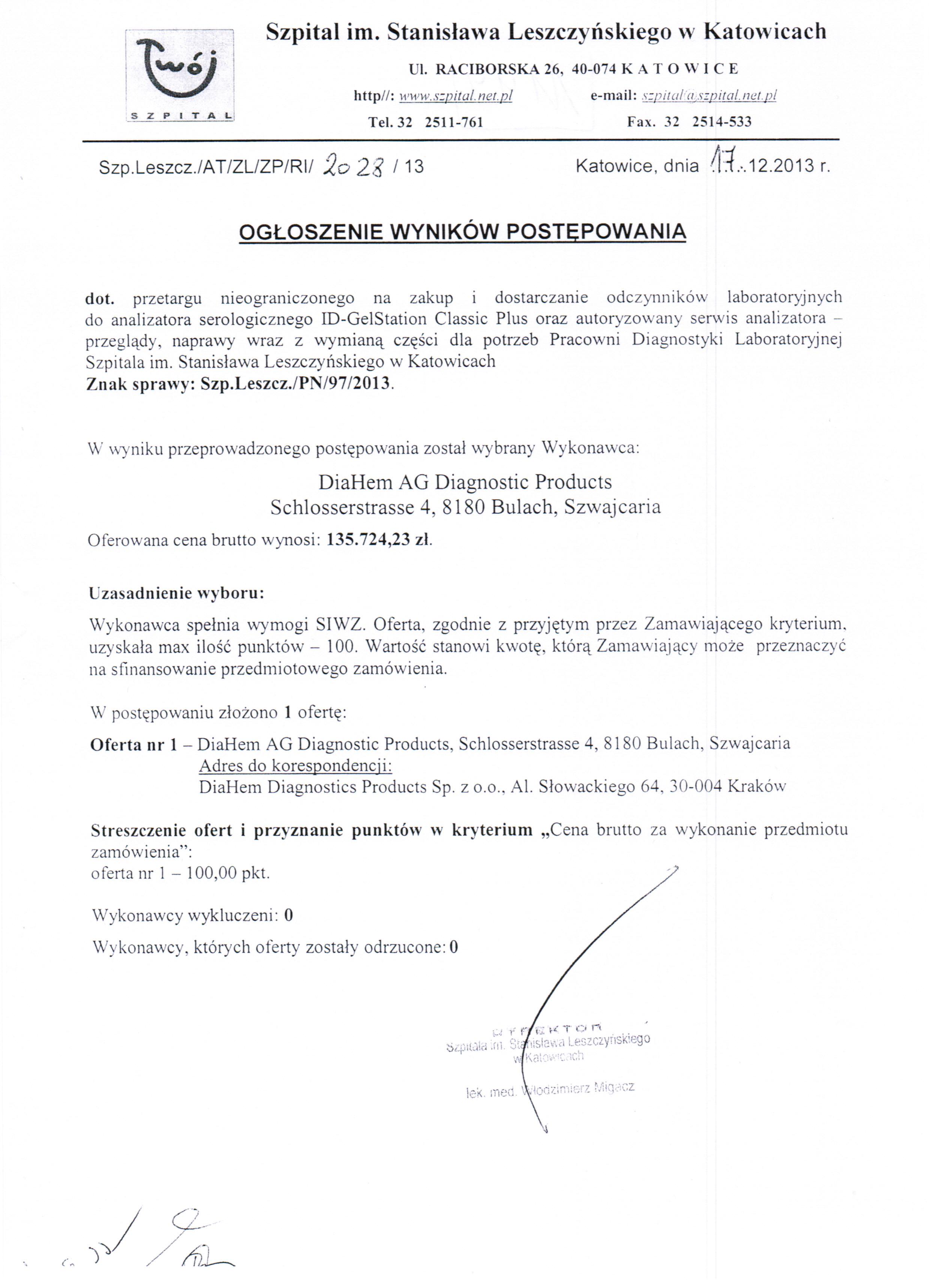 w dniu 06.12.2013 r. o godz. 12:00 w Szpitalu im. Stanisława Leszczyńskiego w Katowicach ul. Raciborska 28, budynek Przychodni, II piętro, Sekcja Zamówień Publicznych.