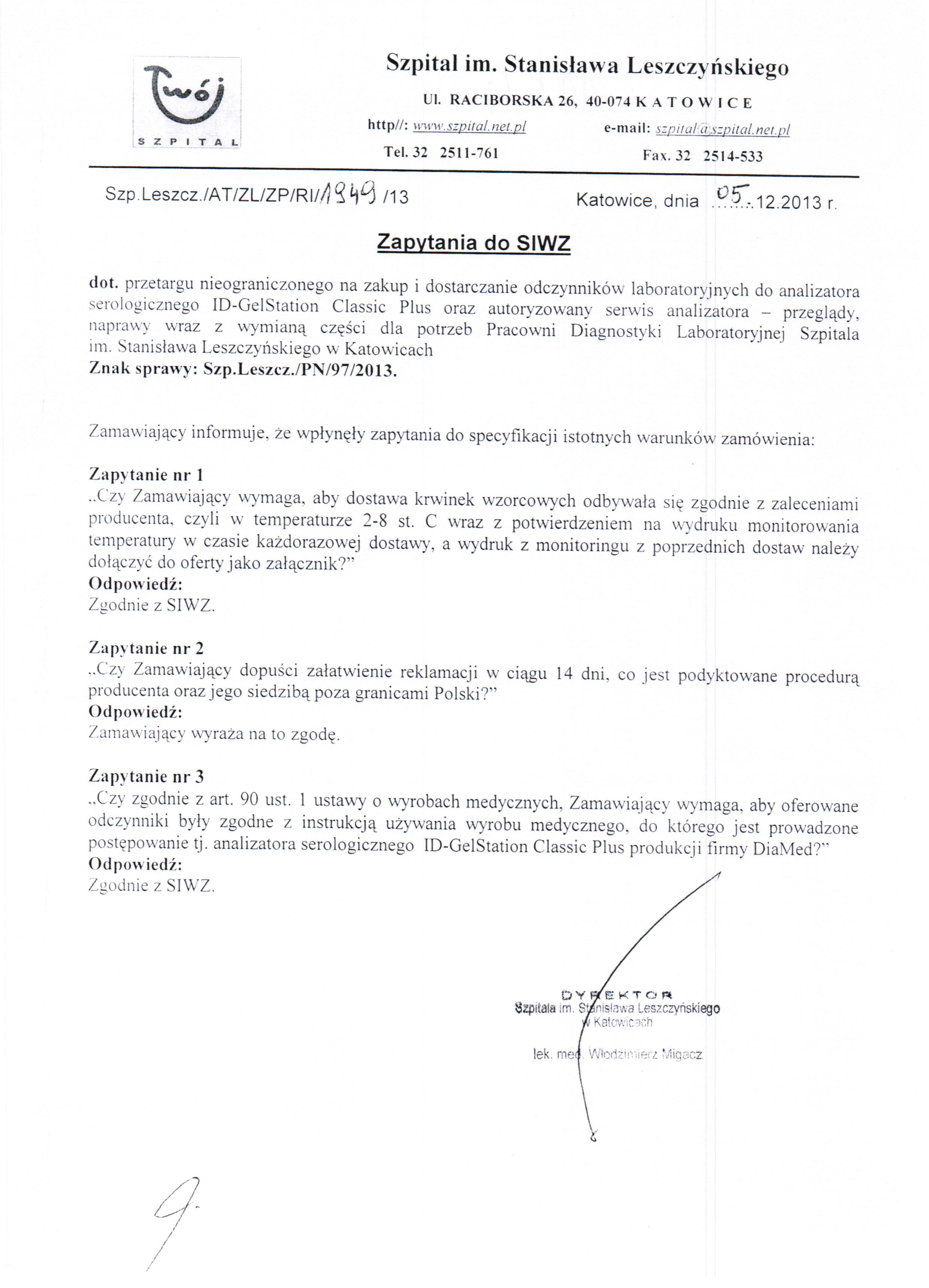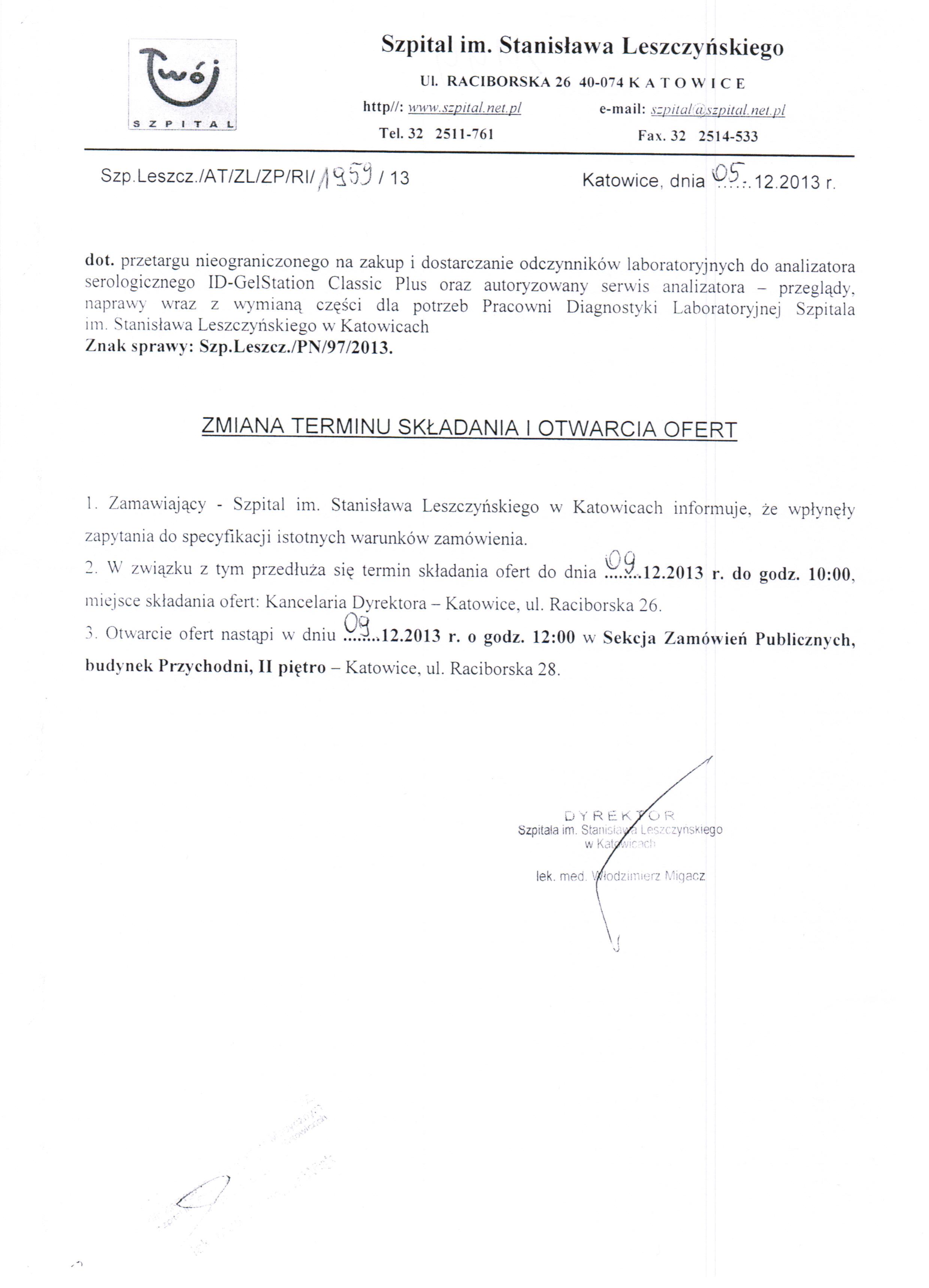 do dnia 06.12.2013 r. do godz. 10:00 w Szpitalu im. Stanisława Leszczyńskiego w Katowicach ul. Raciborska 26 – Kancelaria Dyrektora.