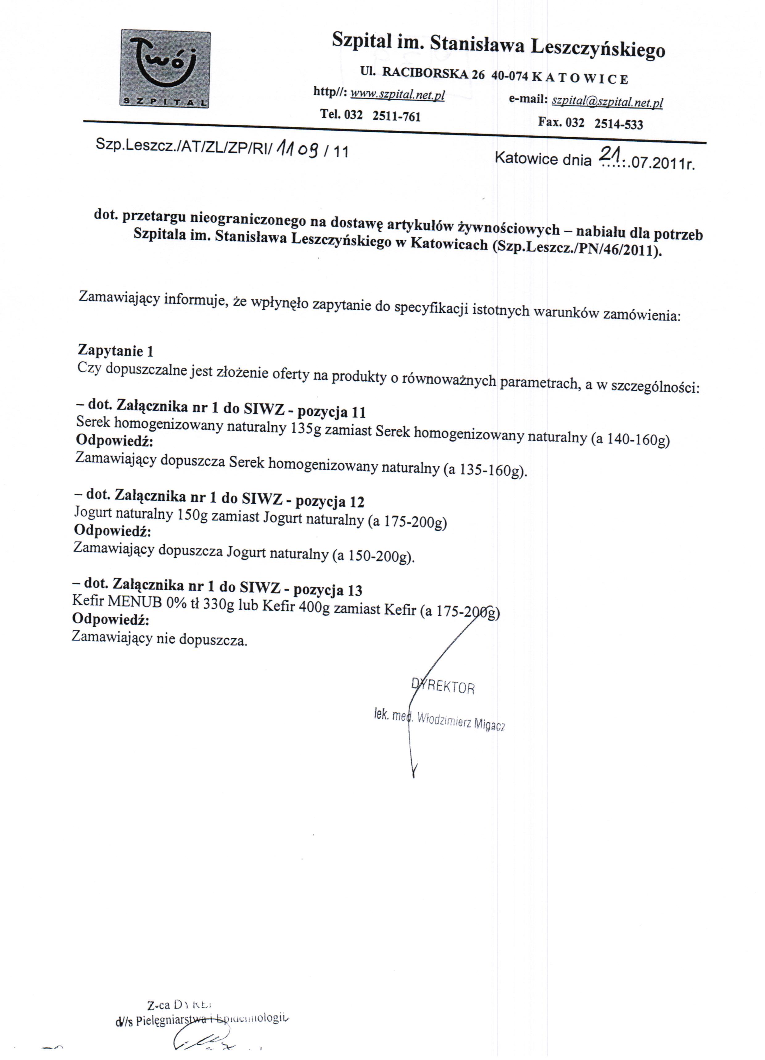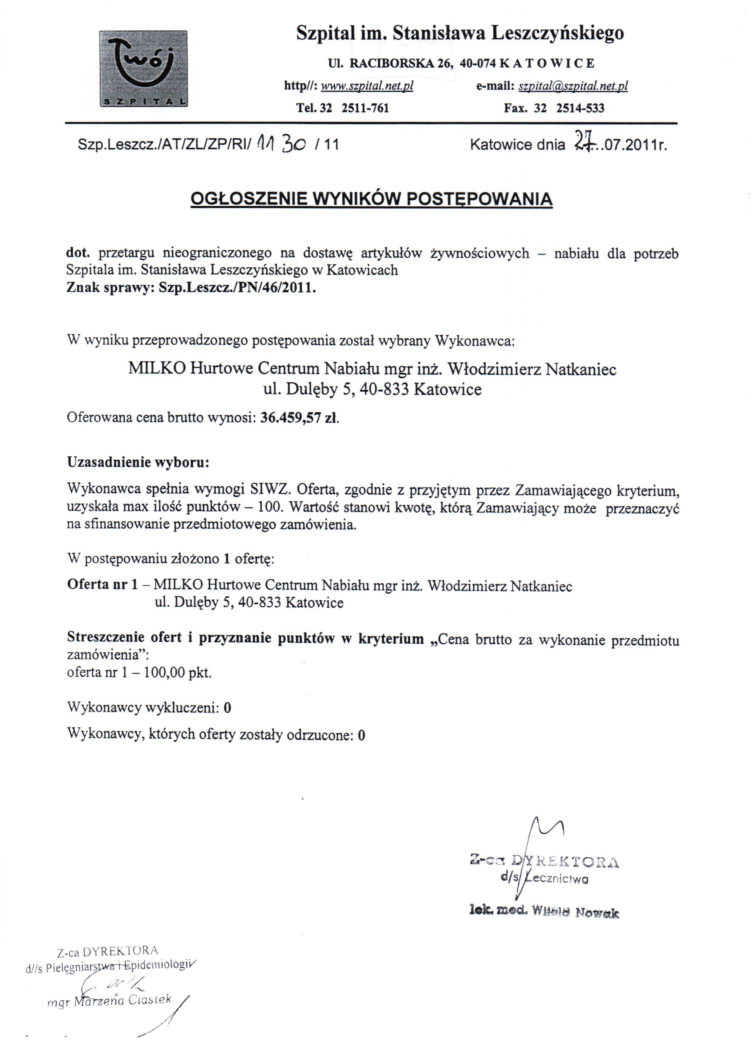 do dnia 25.07.2011r. do godz. 10:00 w Szpitalu im. Stanisława Leszczyńskiego w Katowicach ul. Raciborska 26 – Kancelaria Dyrektora.