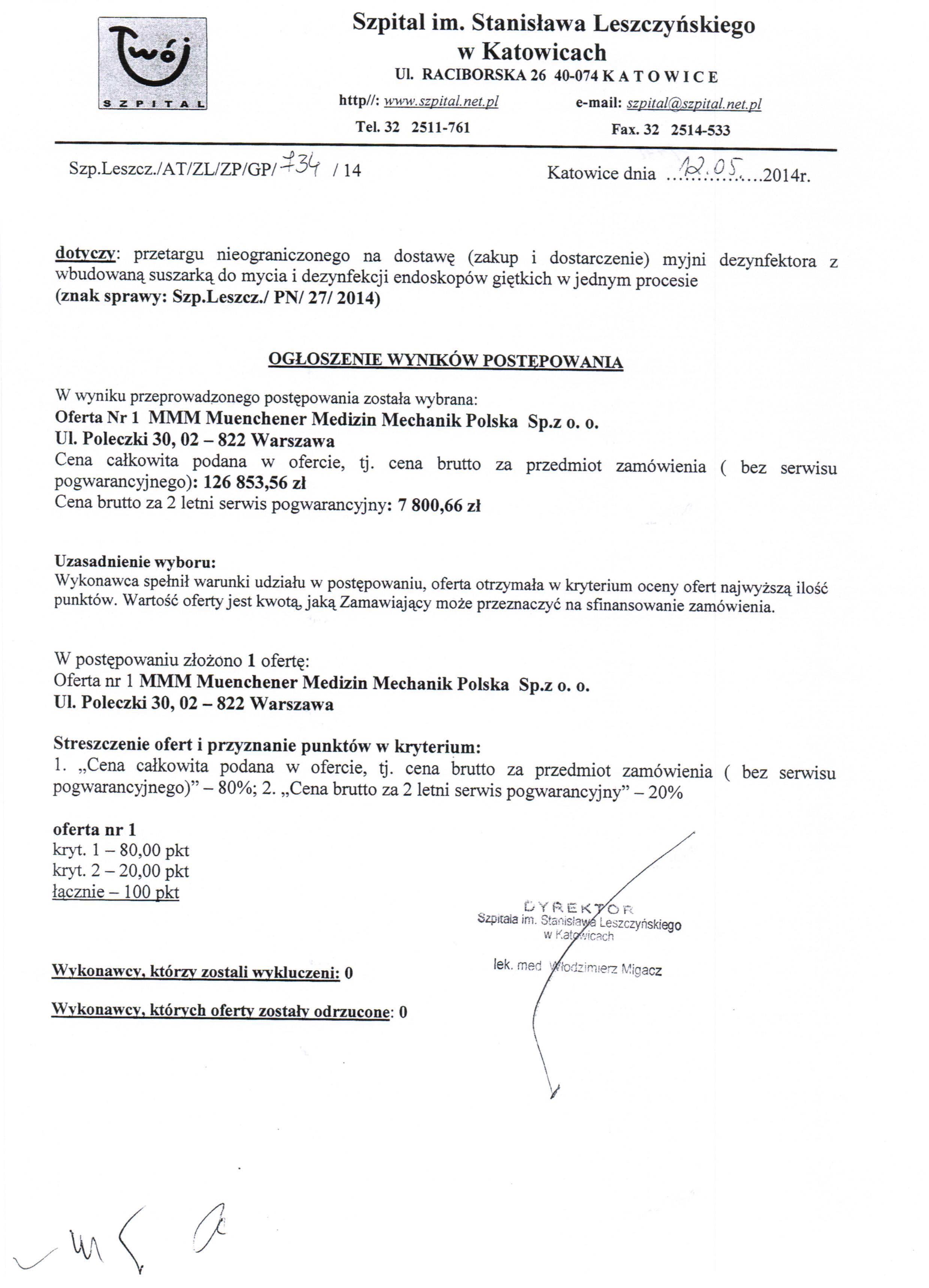 w dniu 25.04.2014r. o godz. 11:00 w Szpitalu im. Stanisława Leszczyńskiego w Katowicach ul. Raciborska 28, budynek Przychodni, II piętro, Sekcja Zamówień Publicznych.