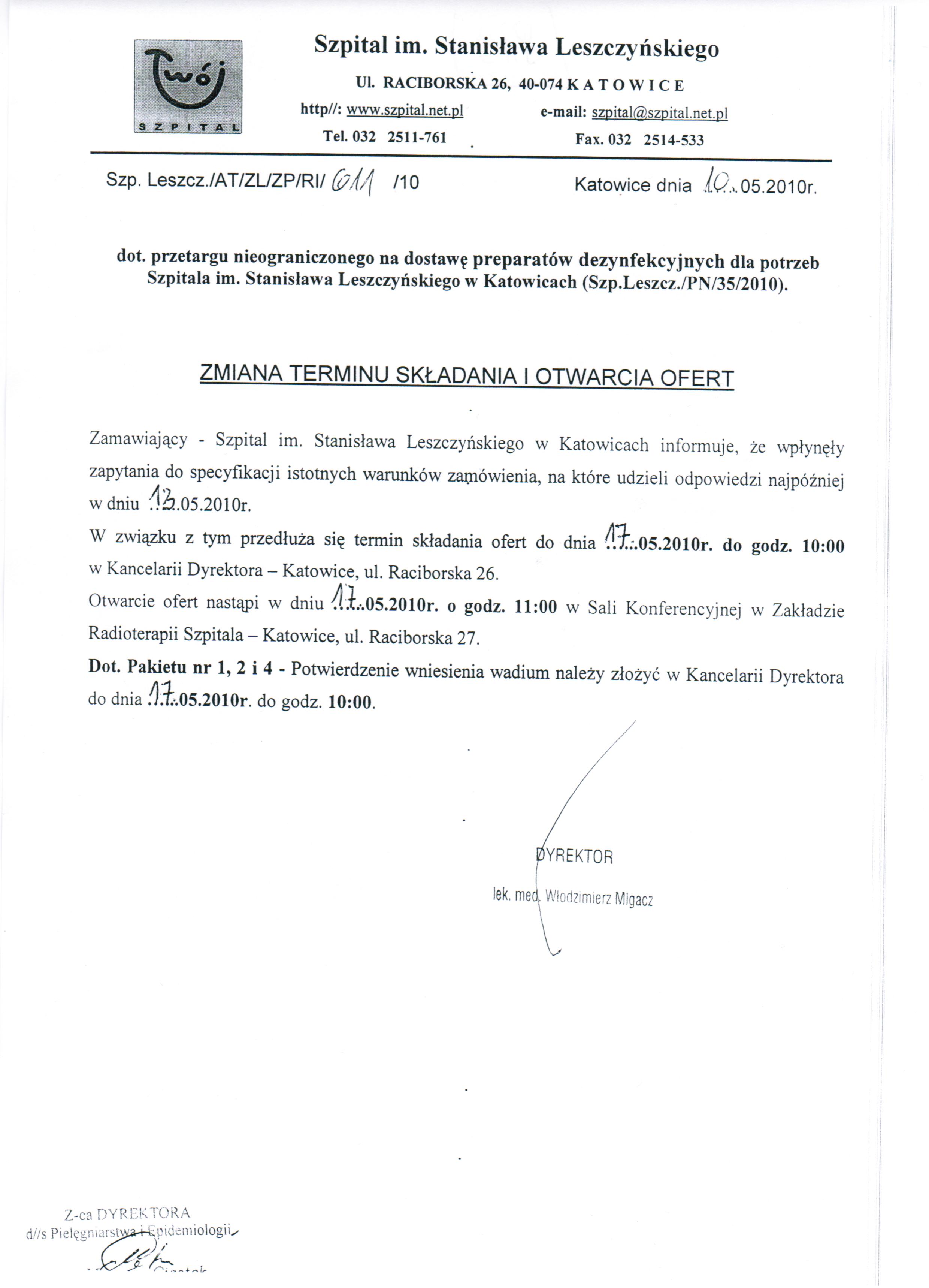 do dnia 13.05.2010r. do godz. 10.00 w Kancelarii Dyrektora Szpitala w Katowicach przy ul. Raciborskiej 26.