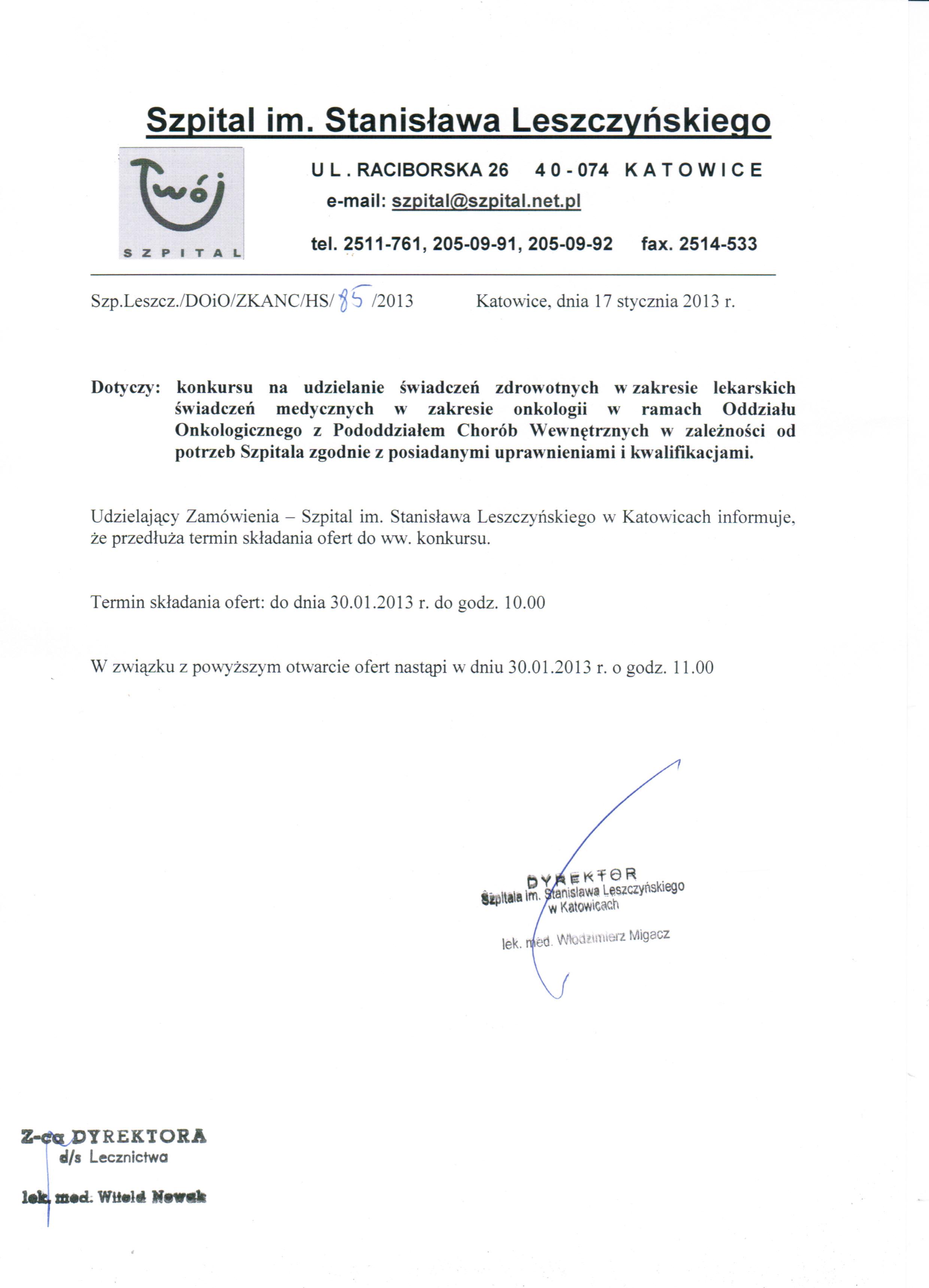 - Oferty należy składać w Kancelarii Szpitala im. Stanisława Leszczyńskiego w Katowicach ul. Raciborska 26 do dnia 21.01.2013 do godz. 10.00.