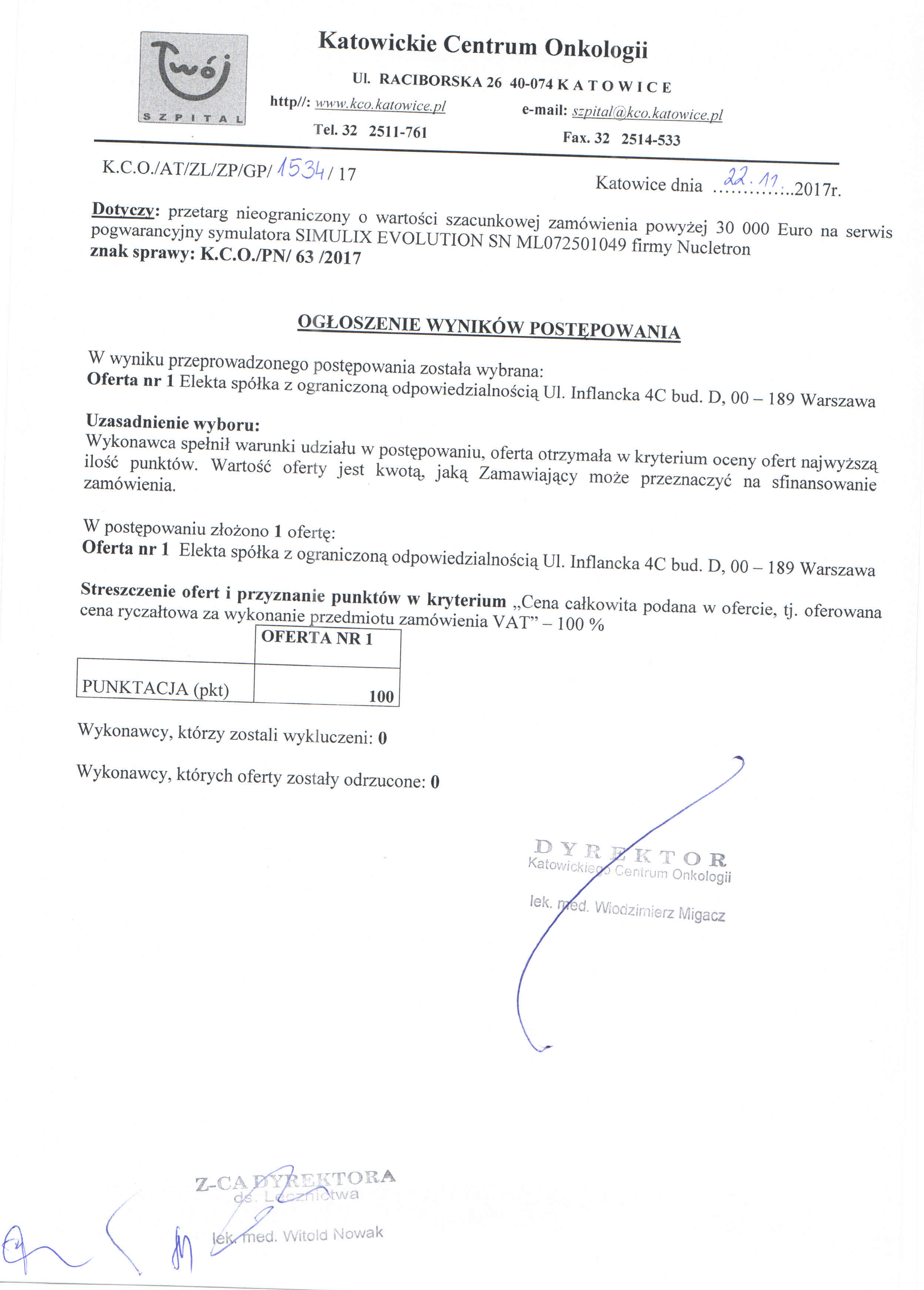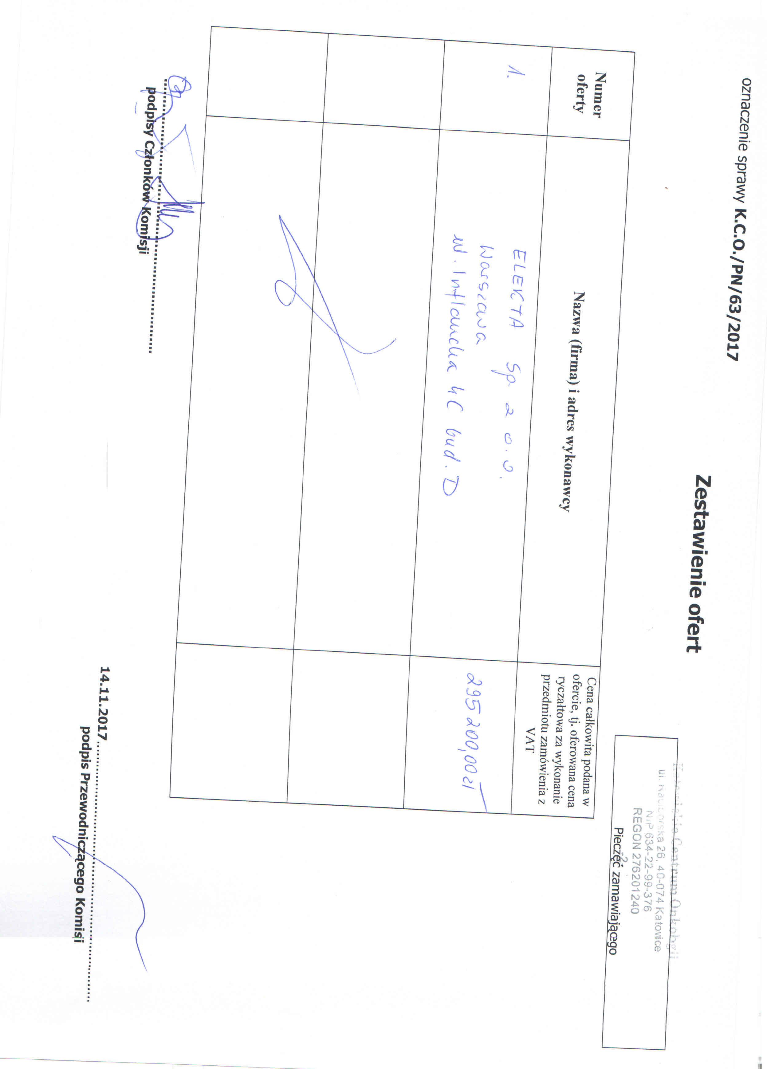 do dnia 14.11.2017r. do godz. 10:00, w 40-074 Katowice, ul. Raciborska 26, Kancelaria Dyrektora, I piętro