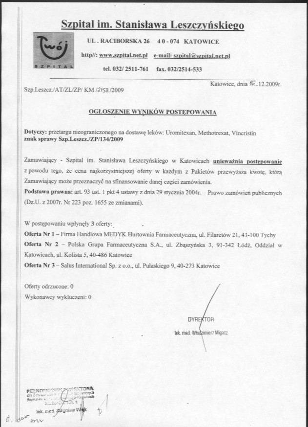 do dnia 10.12.2009r. do godz. 10:00 w Kancelarii Dyrektora Szpitala w Katowicach przy ul. Raciborskiej 26.