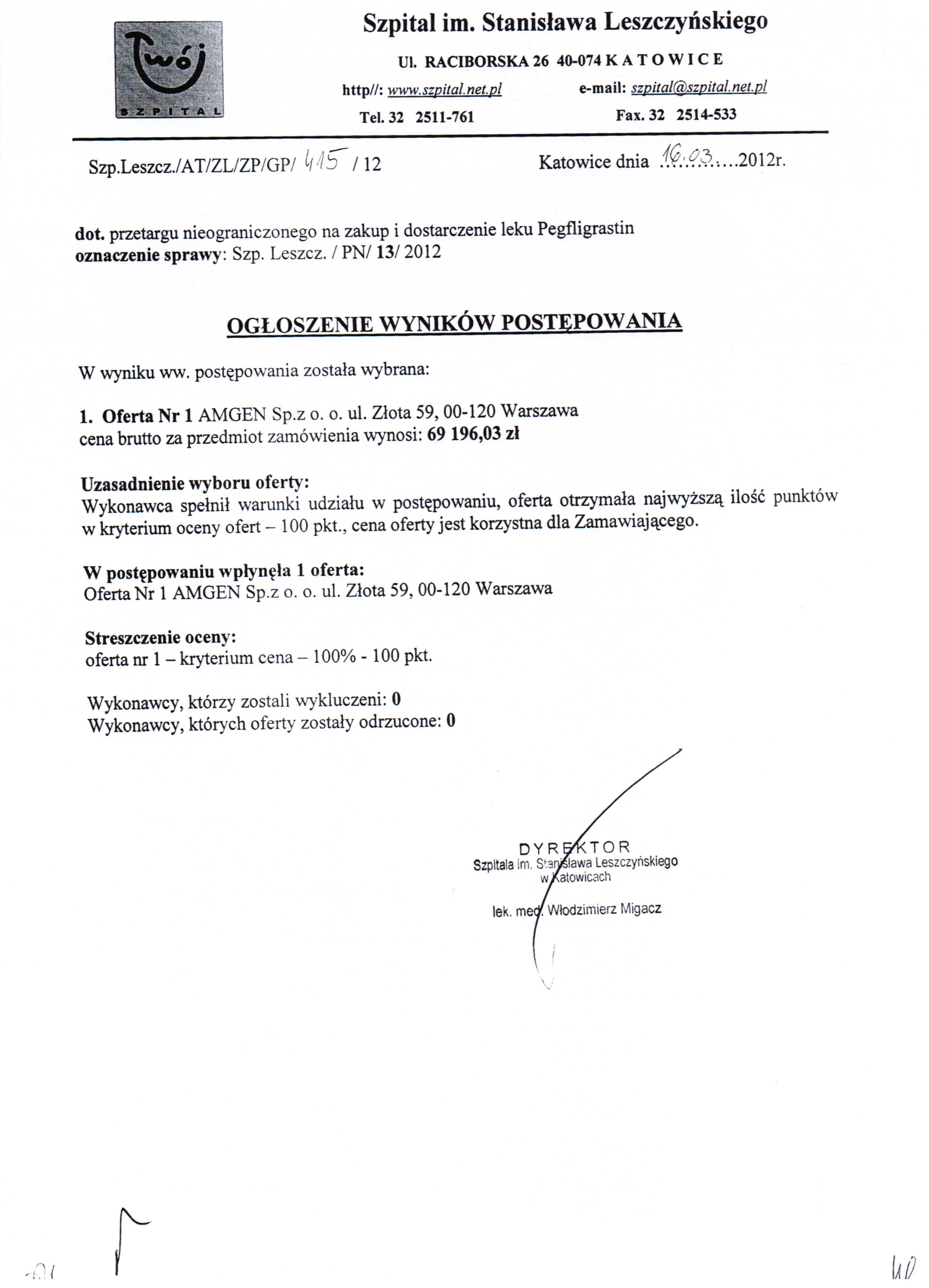 ogłasza przetarg nieograniczony o wartości szacunkowej zamówienia powyżej 14.000 EURO na dostawę leku Pegfligrastin