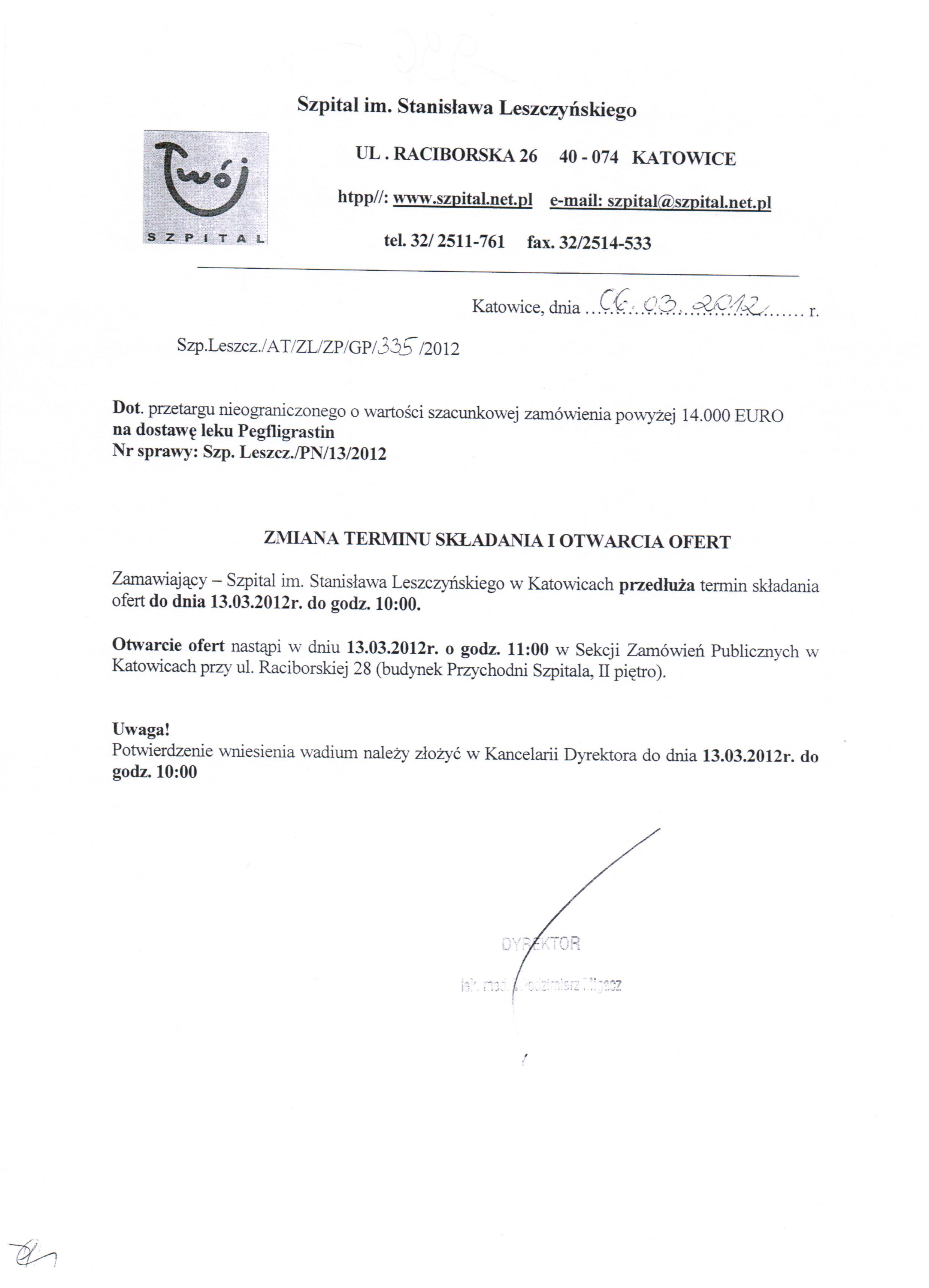 w dniu 06.03.2012r. o godz. 11:00 w 40–074 Katowice, ulica Raciborska 28, budynek Przychodni, II piętro, Sekcja Zamówień Publicznych.