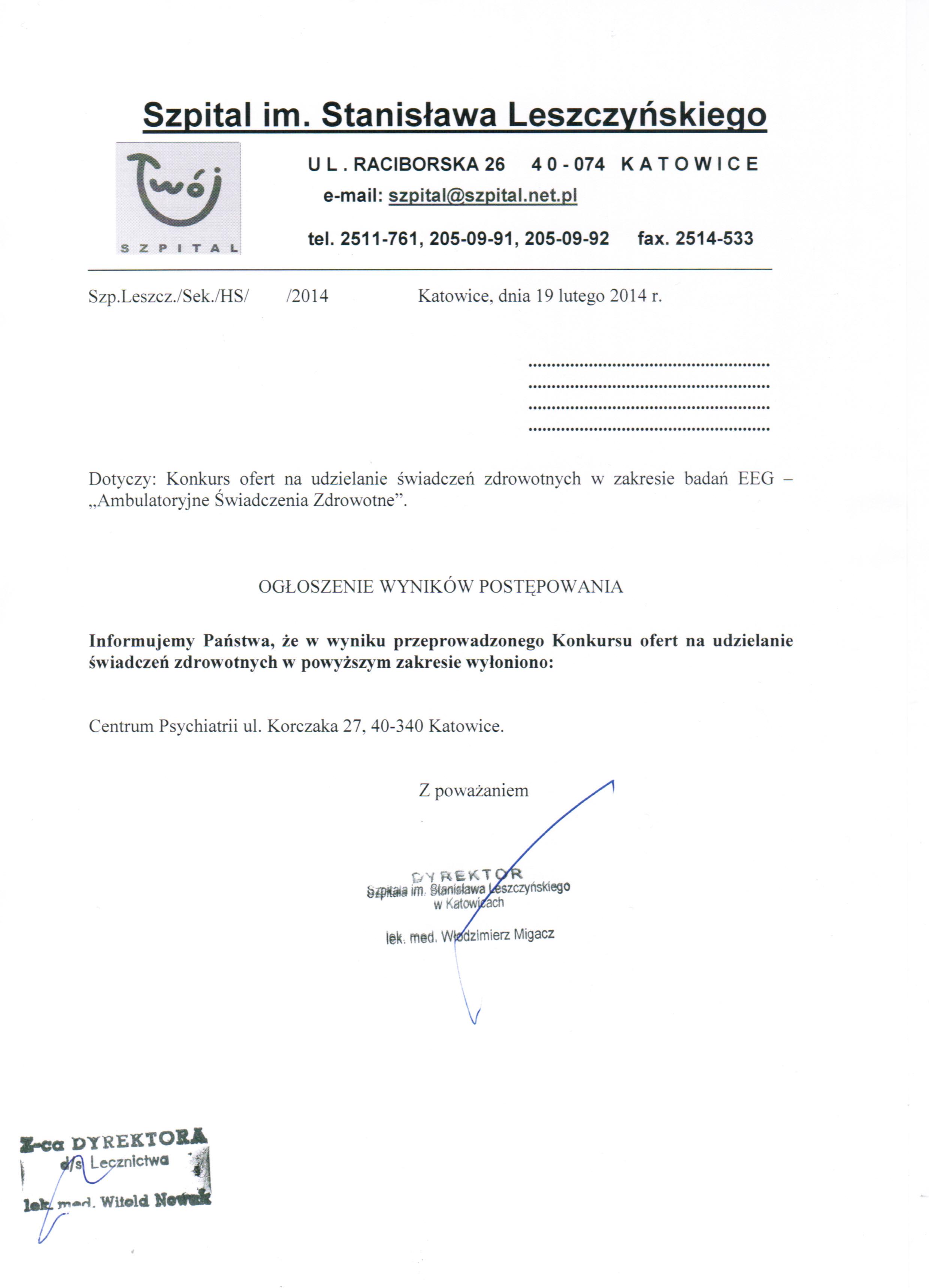 Dodatkowych informacji udziela Z-ca Dyrektora ds. Lecznictwa lek. med. Witold Nowak pod nr tel. (32) 251 17 61.