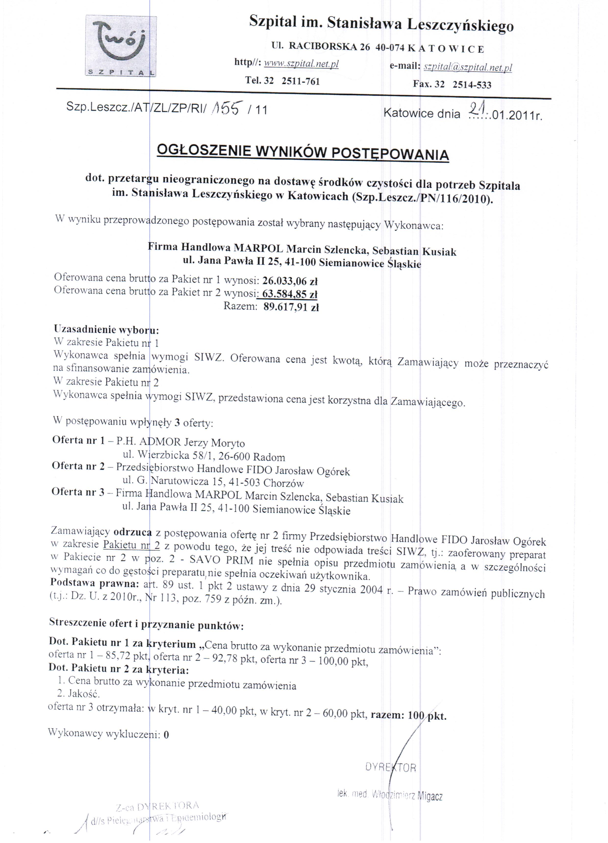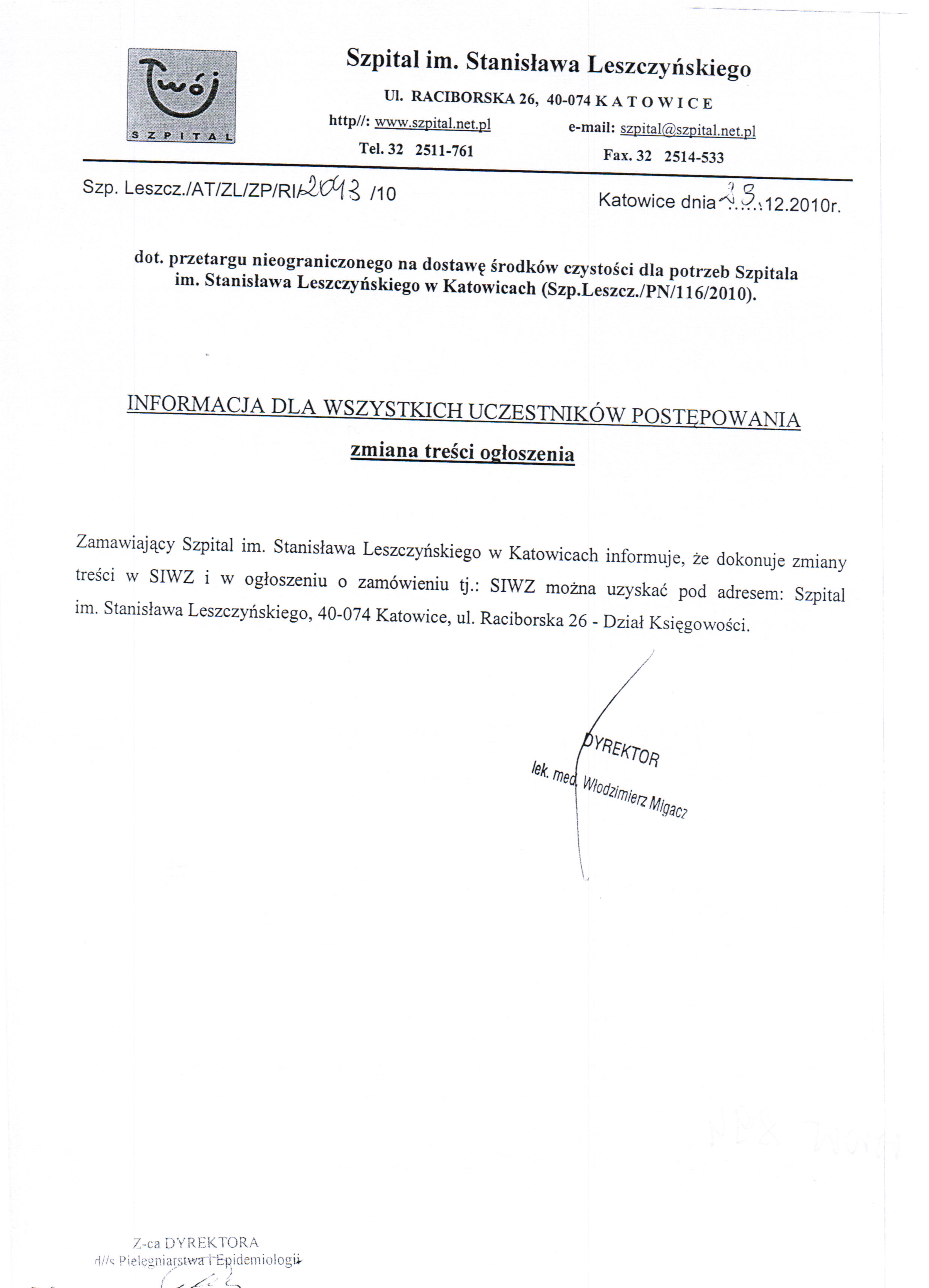 Otwarcie ofert nastąpi w dniu 05.01.2011r. o godz. 11:00 w Szpitalu im. Stanisława Leszczyńskiego w Katowicach ul. Raciborska 28, budynek Przychodni, II piętro, Sekcja Zamówień Publicznych.