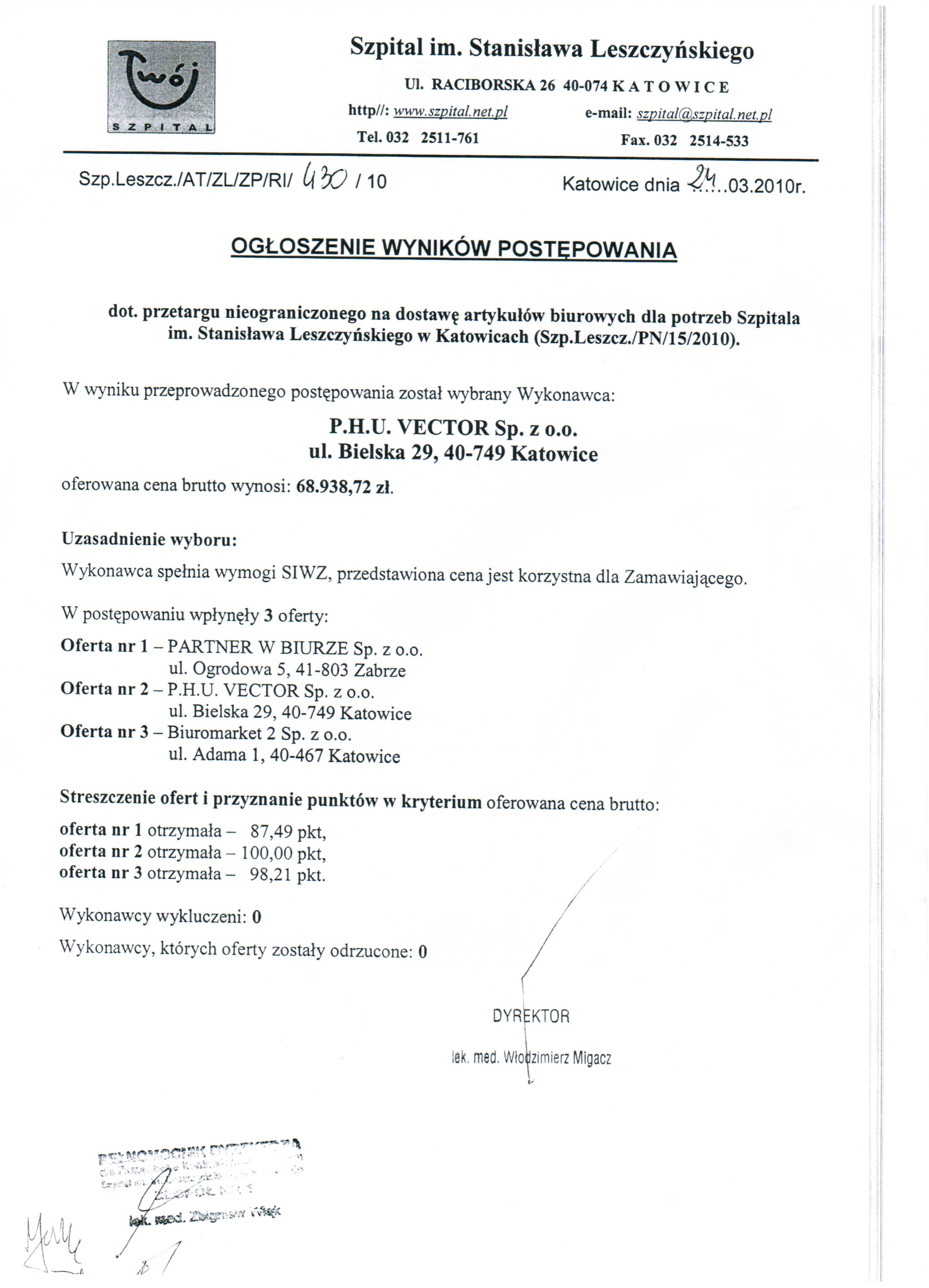 Otwarcie ofert nastąpi w dniu 09.03.2010r. o godz. 11:00 w Sali Konferencyjnej Zakładu Radioterapii w Katowicach przy ul. Raciborskiej 27.
