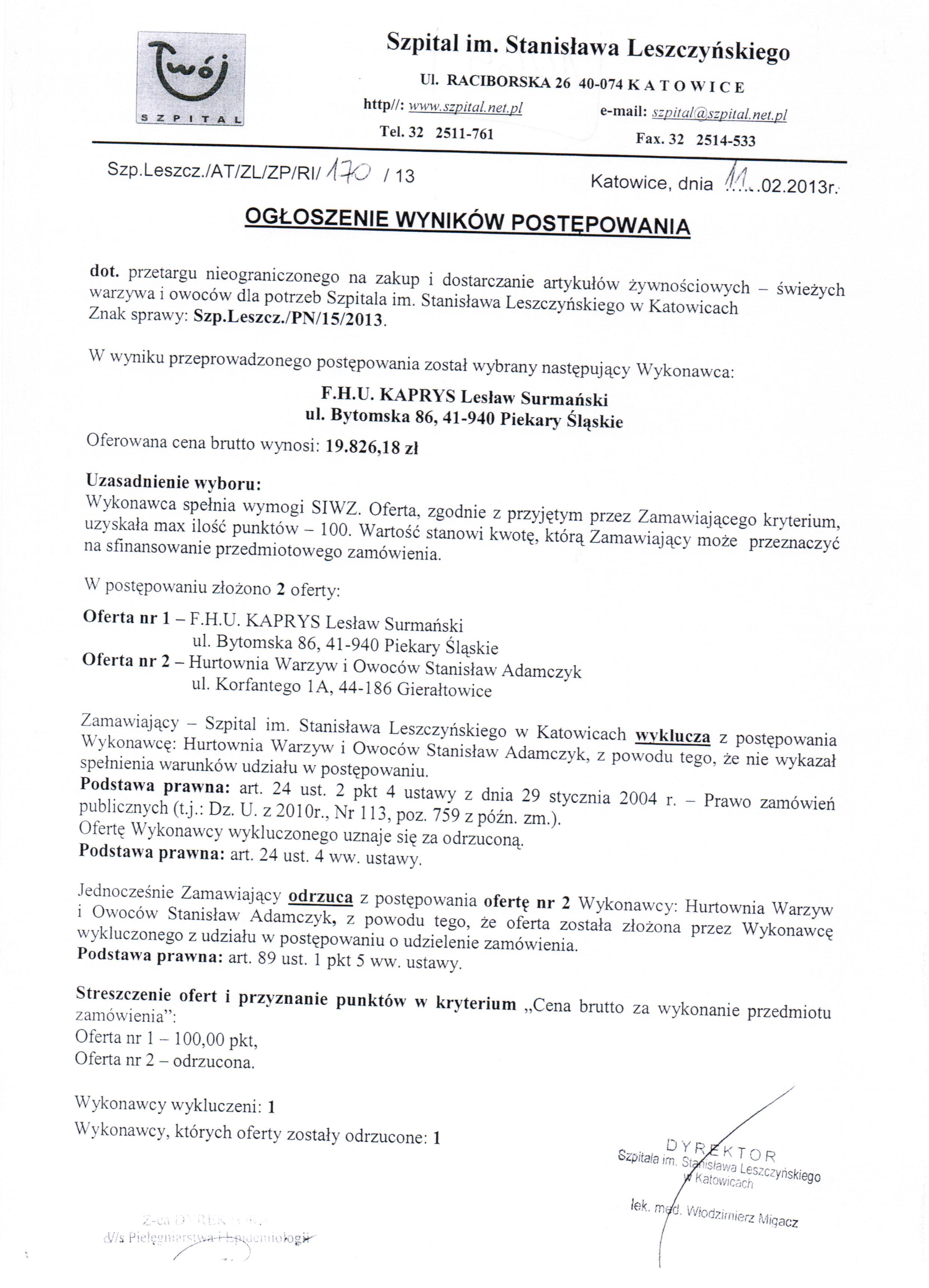 Oferty należy złożyć do dnia 30.01.2013 r. do godz. 10:00 w Szpitalu im. Stanisława Leszczyńskiego w Katowicach ul. Raciborska 26 – Kancelaria Dyrektora.