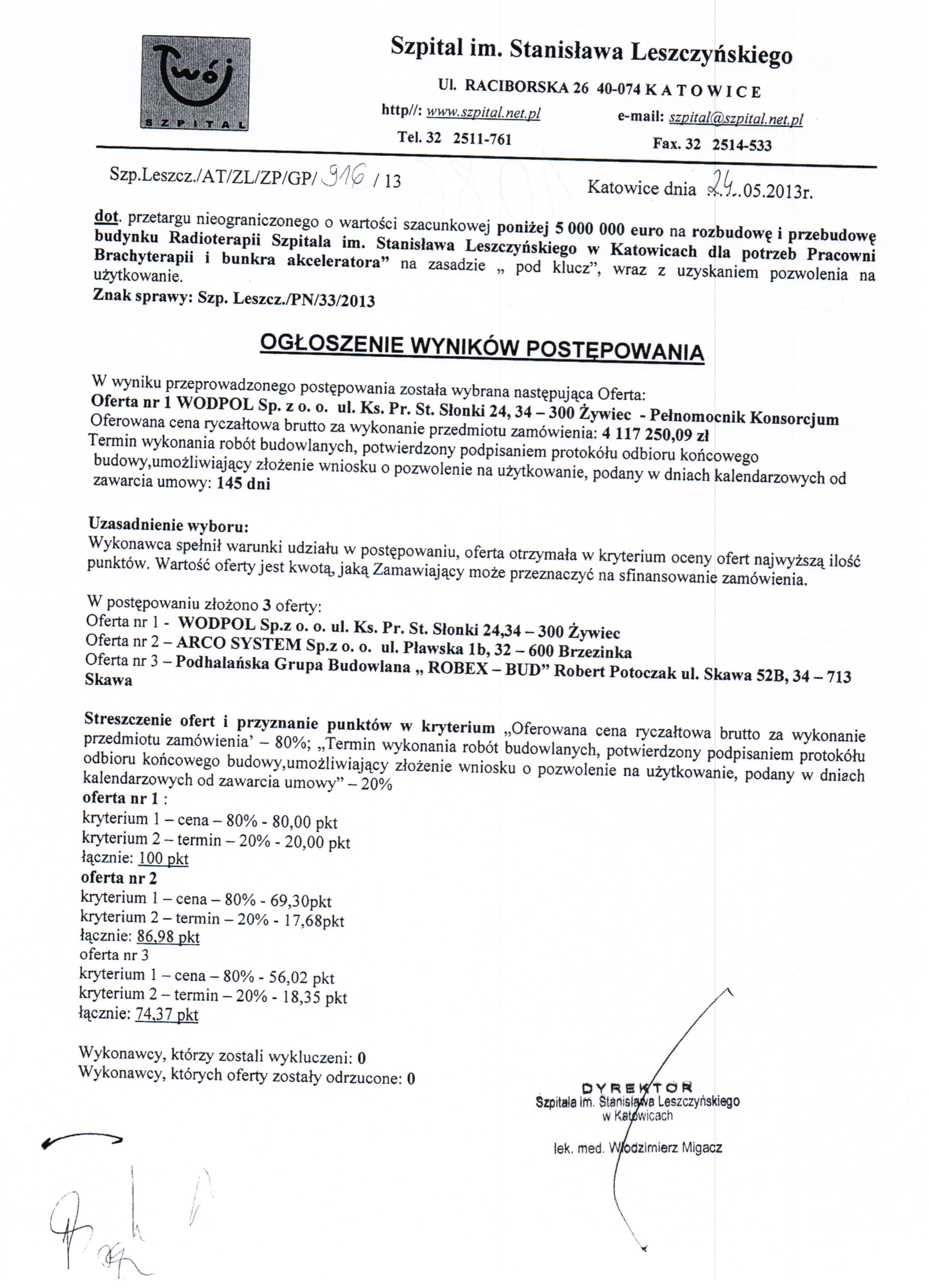 Ogłoszenie wyników postępowania - 24.V.2013r.
