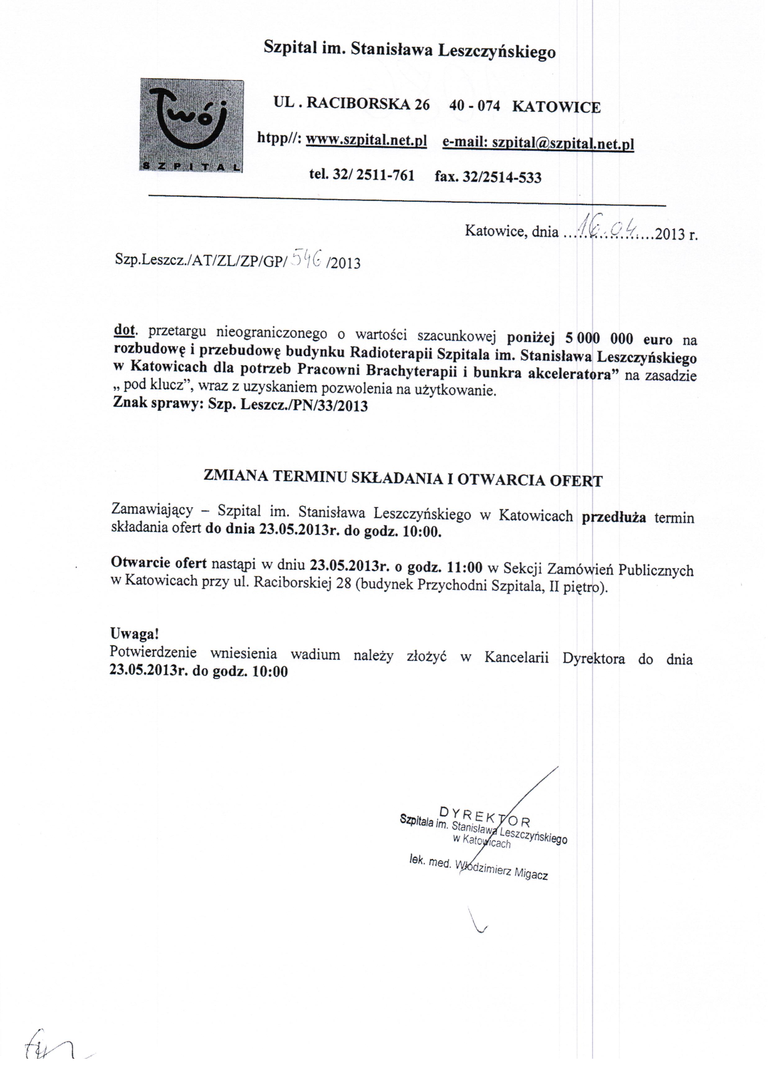 Otwarcie ofert nastąpi w dniu 23.04.2013r. o godz. 11:00 w Sekcji Zamówień Publicznych Szpitala w Katowicach przy ul. Raciborskiej 28( budynek Przychodni Szpitala, II piętro)